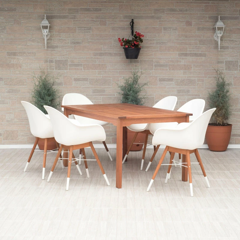 ใ7-Piece SetใThis set includes 6 high quality 100% FSC certified eucalyptus dining armchairs and 1 rectangular table. This set is ideal for both indoors and patio and will make your outdoors an elegant space to enjoy with family and friends.