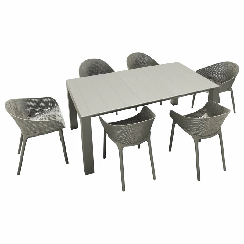 Sky indoor outdoor dining set with 6 dining chairs and one extendable table which extends from 70 to 86 inches. Contemporary design. Chairs have a flexible seat that provides more comfortable seating. Durable for outdoor temperatures. Easy cleaning. Perfect for heavy use indoor outdoor areas.