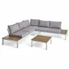 - Includes 3 corner chairs, 1 table and 3 ottomans for versatile use