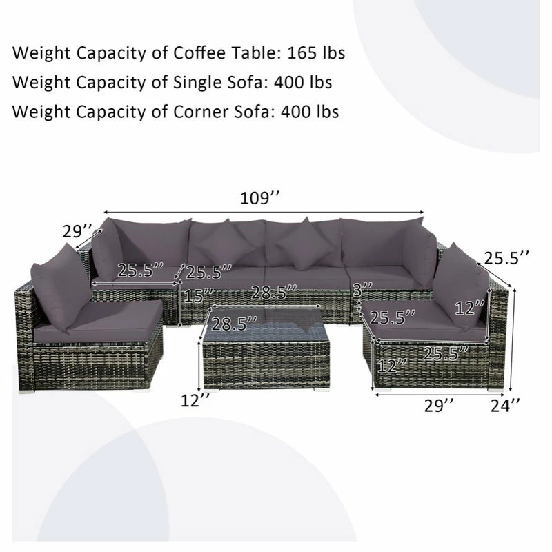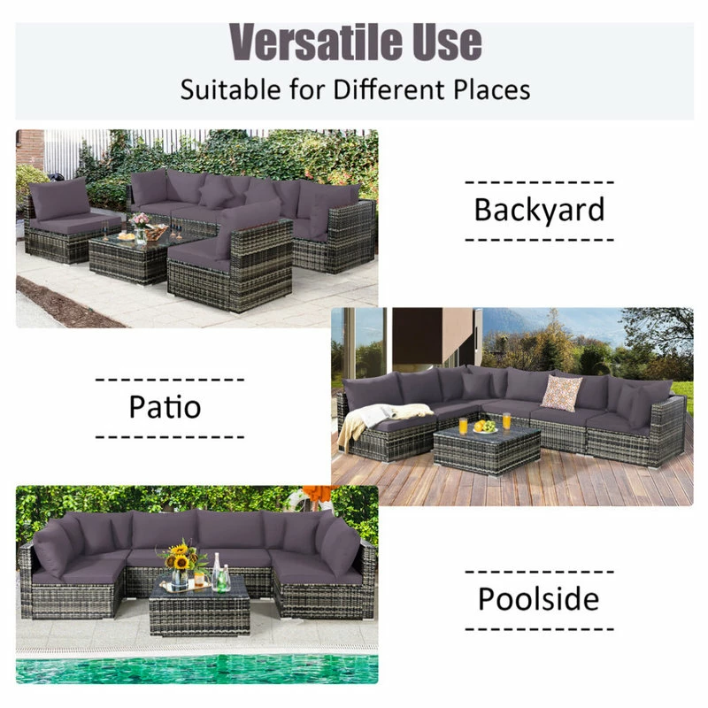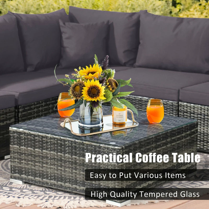Featuring 1 large coffee table, 2 corner sofas and 4 single sofas, the position and combination of this outdoor conversation set can be adjusted freely based on your various demands. Therefore, you can choose an appropriate combination to make outdoor life more comfortable. With soft cushions and pillows, this wicker sectional sofa set makes you feel cozy while sitting. Moreover, this 7 pcs sectional rattan sofa set is made of all-weather PE rattan and supported by heavy duty steel frame with rustproof surface so that it is perfect for outdoors. And the anti-rust aluminum feet prevent direct contact between furniture and ground for a long time use. Additionally, the coffee table with high quality tempered glass allows you to put different items with ease. And the removable covers can be washed for daily maintenance.