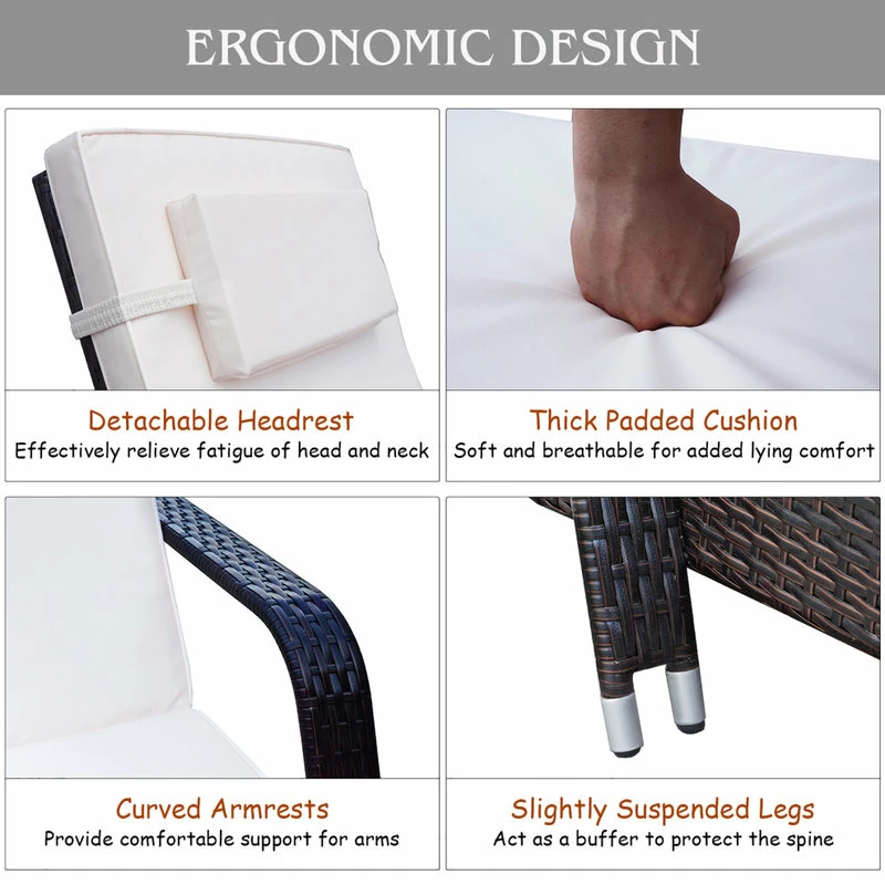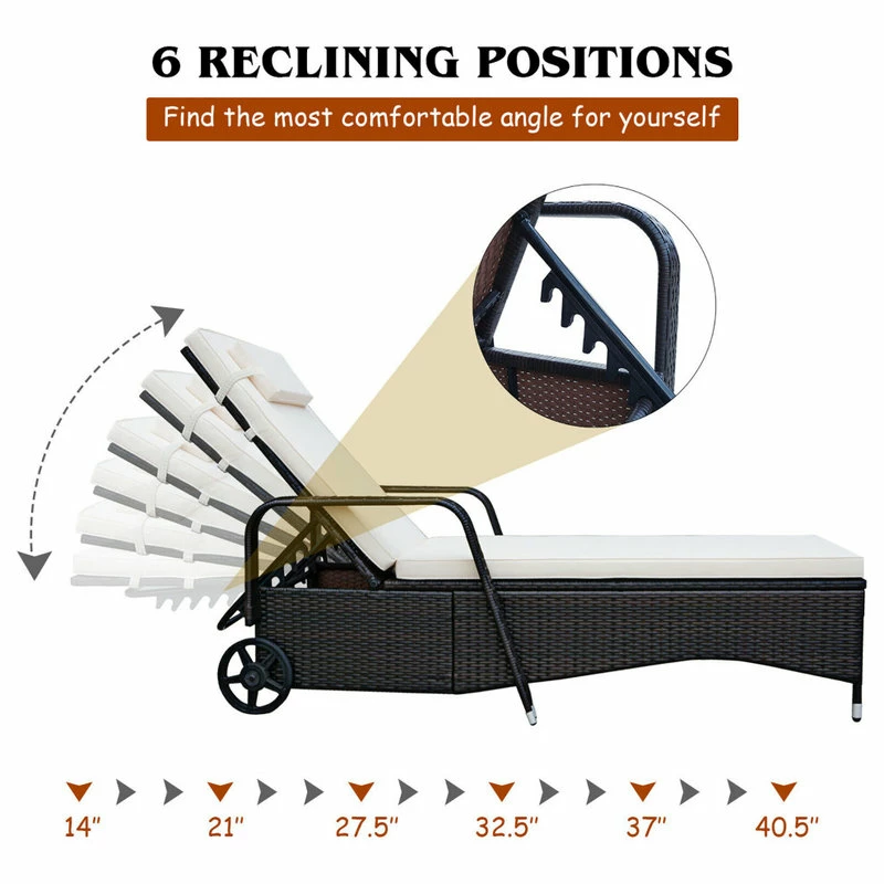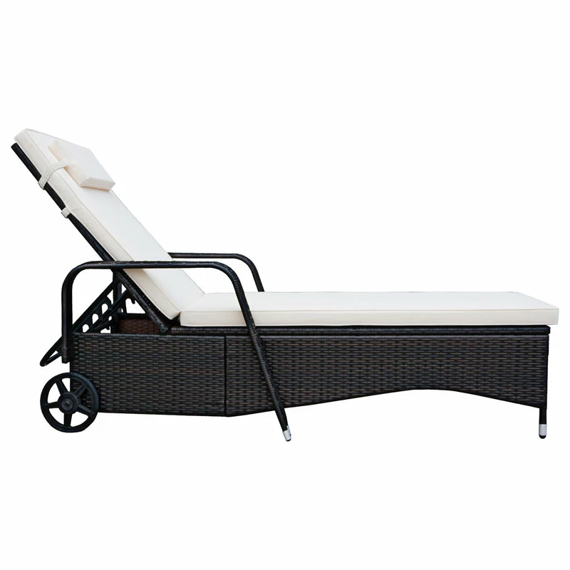 This is our new rattan chaise lounge which is a great addition for your outdoor living room. Made of galvanized steel pipe and rattan ,it will be durable and have long lifespan. Thick and soft cushion provide comfortable feeling when laying, additional headrest pillow comes with it .The backrest is adjustable to six angles ,you can adjust it as you like. Two wheels equipped make you easy to move to anywhere. It is suitable for various occasions,which is your best choice for your living room ,garden, poolside, yard, balcony, beach and veranda etc.