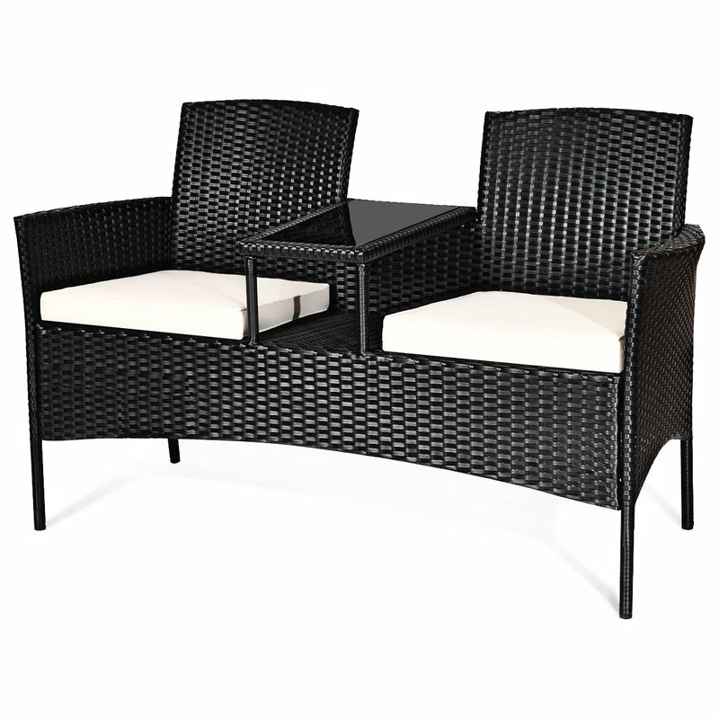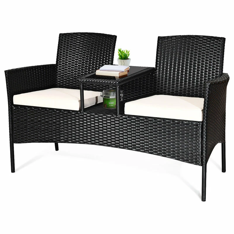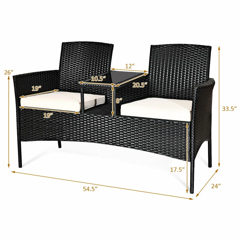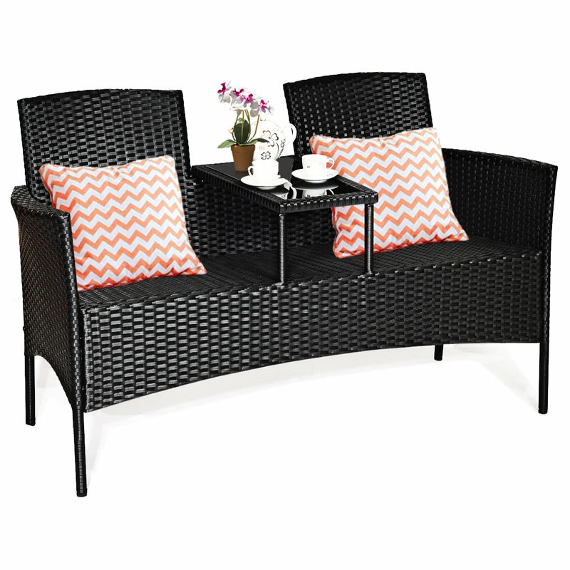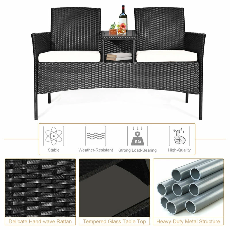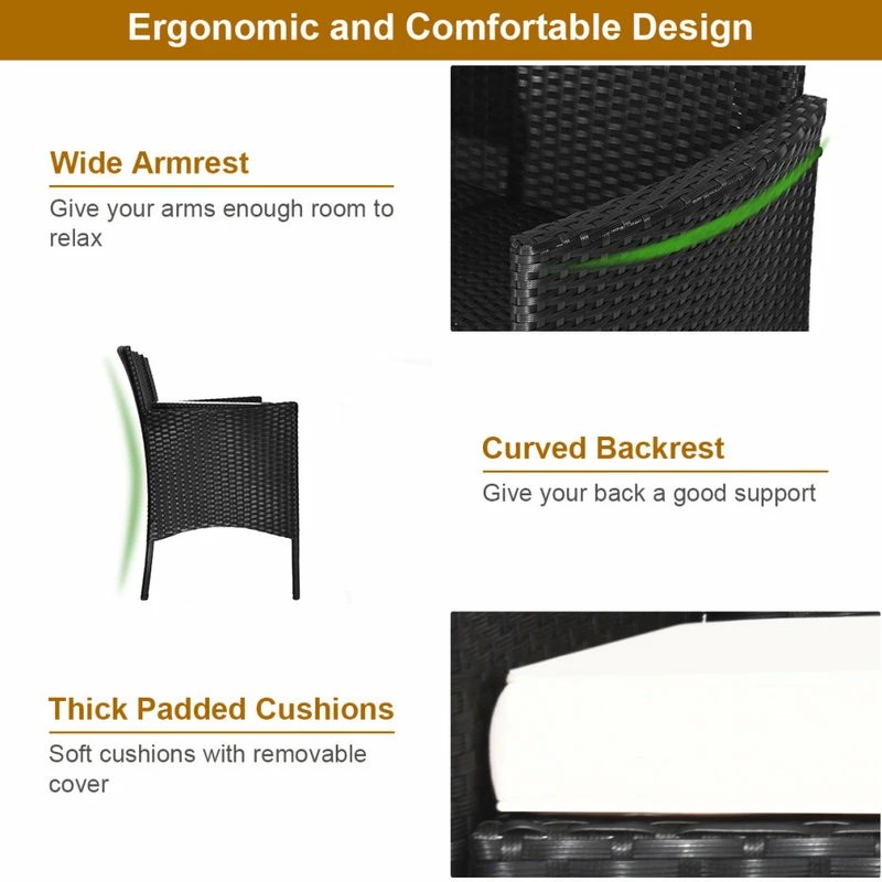 Our patio furniture set in unique style is designed to add an elegant look to your courtyard and provide a comfortable reclining feel for your outdoor leisure time. The patio furniture set is made of excellent rattan and superior steel frame, which ensure years of worry free use. Additionally, featuring wide armrest and high backrest, this conversation doubles comfy. More, space-saving and compact design ensures that it is great for small space. And convenient chat table with tempered glass top is large enough for books, cups and so on. It is perfect for garden, patio, pool side and other outdoor living space.