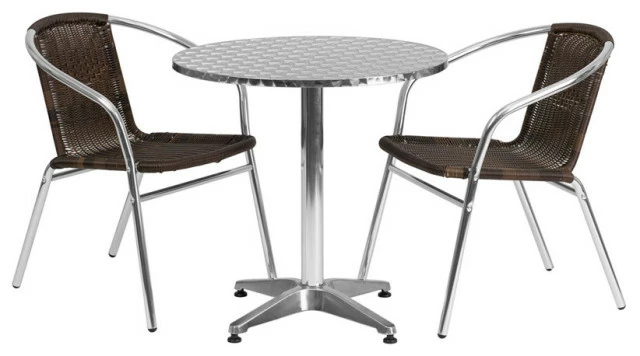 Create an enjoyable dining experience with this table set that will enhance your bistro, cafe, restaurant, hotel or home patio space. The designer style stainless steel table top features a smooth surface for keeping items level. The column and base are constructed of lightweight aluminum material. The chair is lightweight and easy to move and store. For easy storing and cleaning purposes these chairs stack up to 20 chairs high. This set was designed for all-weather use making it a great option for indoor and outdoor settings. For longevity, care should be taken to protect from long periods of wet weather.