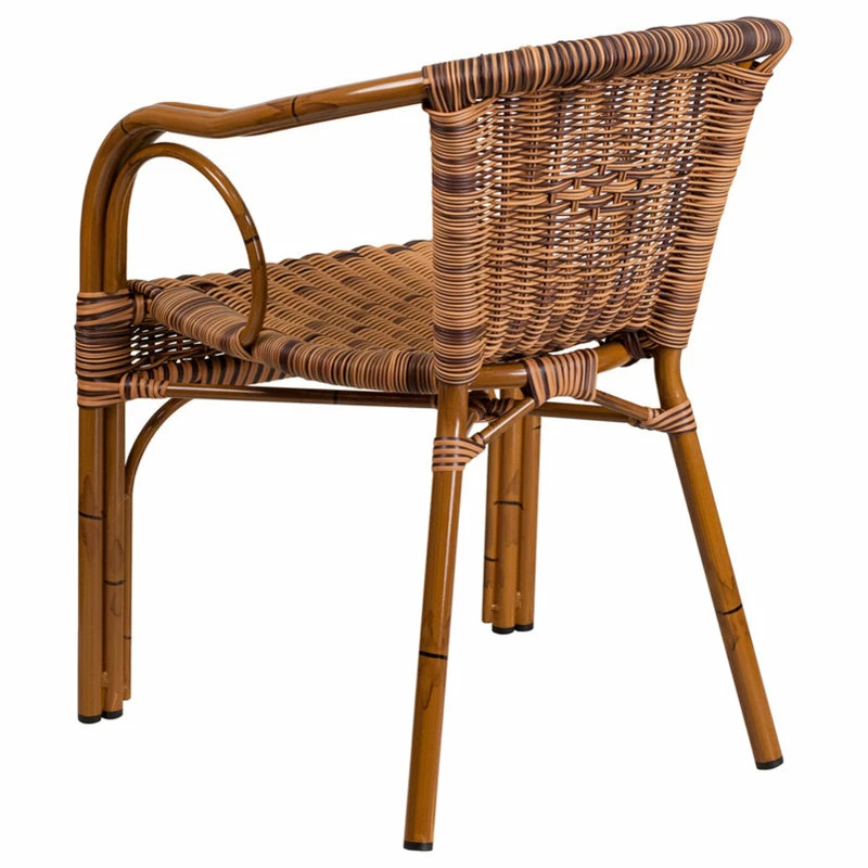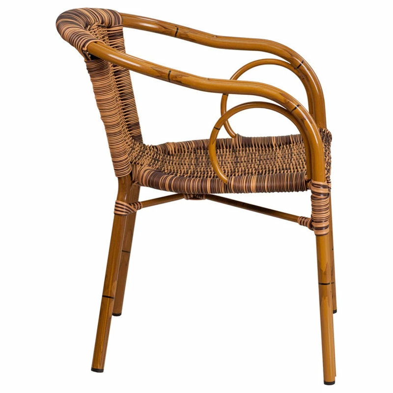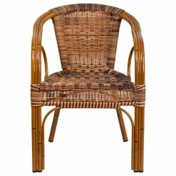 Add pizzazz to your indoor or outdoor space with this lovely crafted chair! This chair features a lightweight aluminum frame that replicates the look of bamboo with skillfully woven rattan seating. The curved back along with the rattan seating assists in keeping you comfortable. Cross braces provide extra stability. The protective plastic feet prevent damage to flooring. The frame is designed for all-weather use making it a great option for indoor and outdoor settings. For longevity, care should be taken to protect from long periods of wet weather.