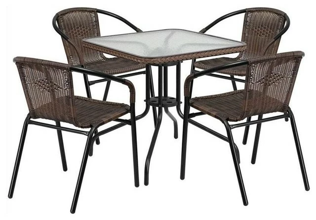 - Flash Furniture TLH-073SQ-037BN4-GG 28” Square Glass Metal Table With Dark Brown Rattan Edging And 4 Dark Brown Rattan Stack Chairs Features: