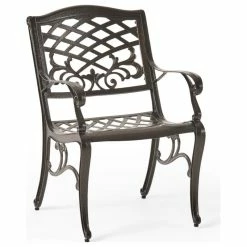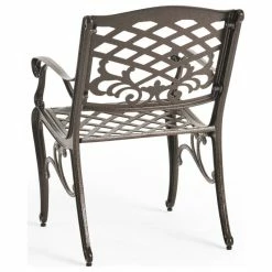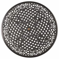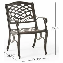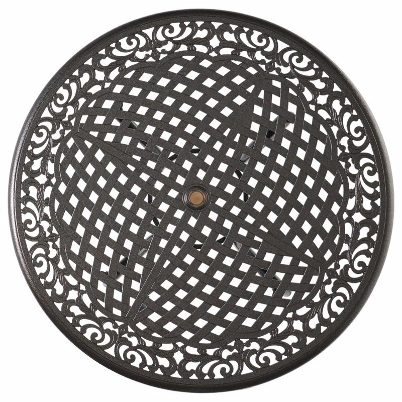 Take in the beauty of the great outdoors in a dining set that brings your next outdoor brunch or dinner party a luxurious atmosphere. Made from sleek cast aluminum, our dining set includes four chairs and one circular table of incredible durability and style. This set features an open metal weave motif with a beautiful scroll design that highlights its elegant hand-crafted details. Whether in your backyard, patio, or deck, this dining set will certainly set the scene for you and your friends to enjoy.