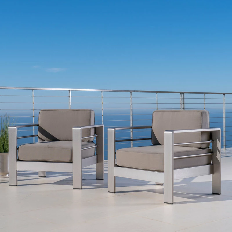 Breathe modern life into your outdoor living area with these sleek and chic outdoor club chairs. These sophisticated and refined chairs feature water-resistant cushions, which make them brilliant additions to your outdoor space. Made of durable aluminum with open-slatted frames, these contemporary chairs are truly unique. Pair them with an equally chic coffee table for a laid-back, yet elevated aesthetic. Design a patio living space that reflects your love of modern design, starting with this stylish pair of outdoor club chairs.