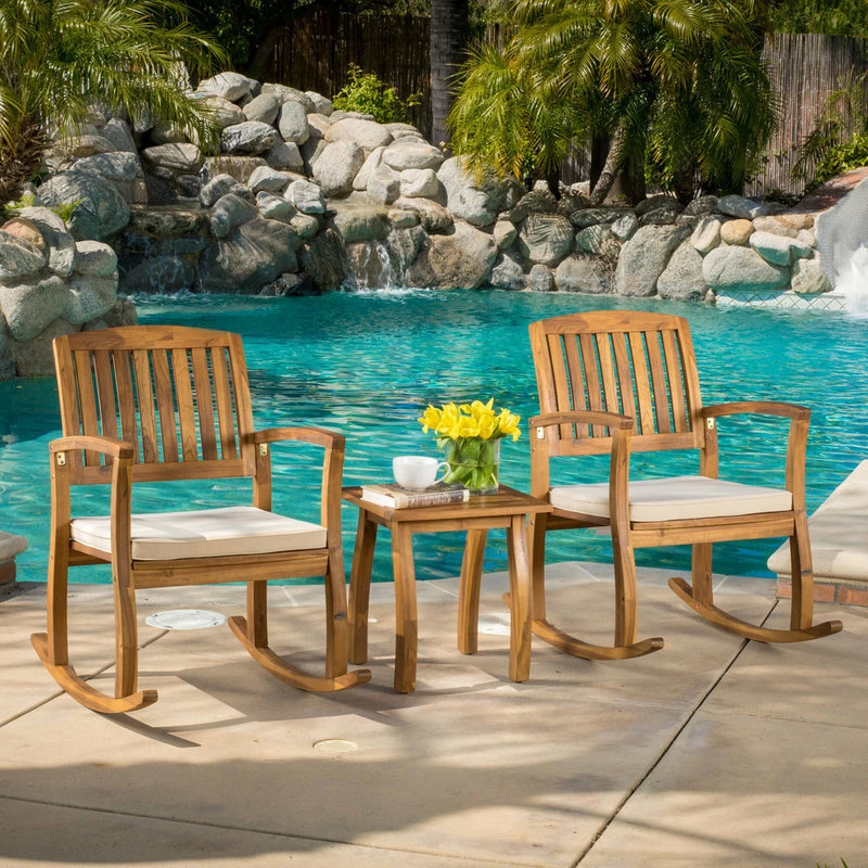 Enjoy a peaceful day in your backyard with these acacia wood rocking chairs and accent table. Not only are they made of sturdy acacia wood that won’t bend to the elements easily, but they also come with water resistant cushions for the chairs, ensuring that your pieces lasts for years to come.