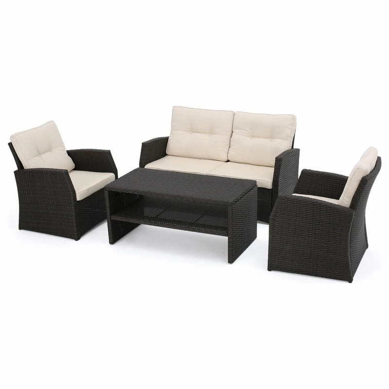 This four-piece chat set is a fantastic addition to any patio. Made with top quality polyethylene wicker and extra plush cushions, this set is sure to be a hit in your patio. Enjoy hosting outdoors with this set, including 2 club chairs, 1 loveseat, and a perfectly sized coffee table.