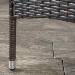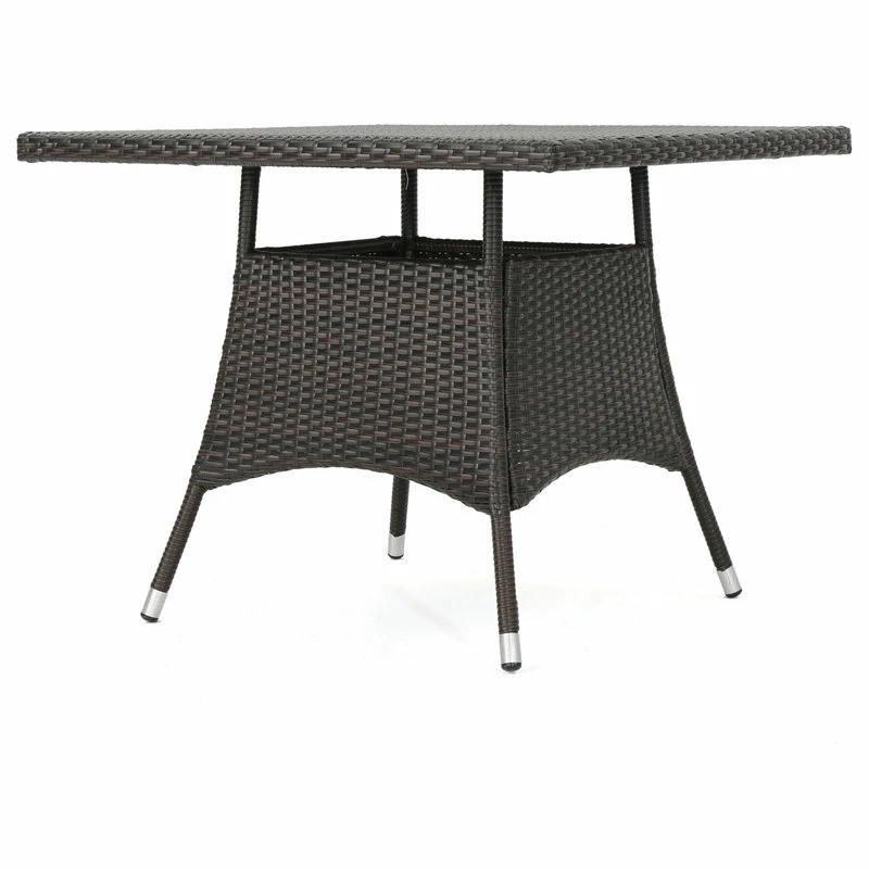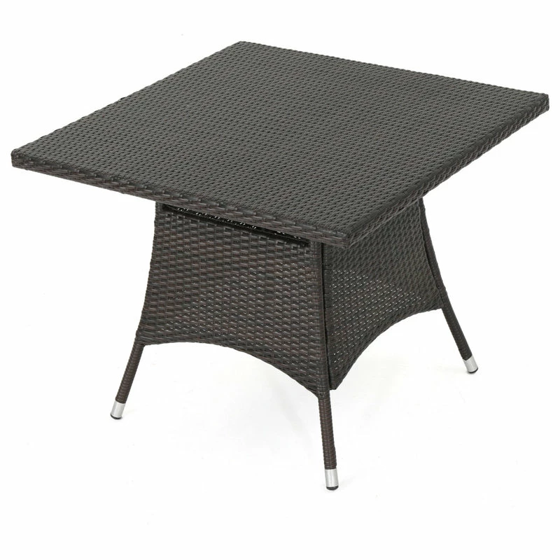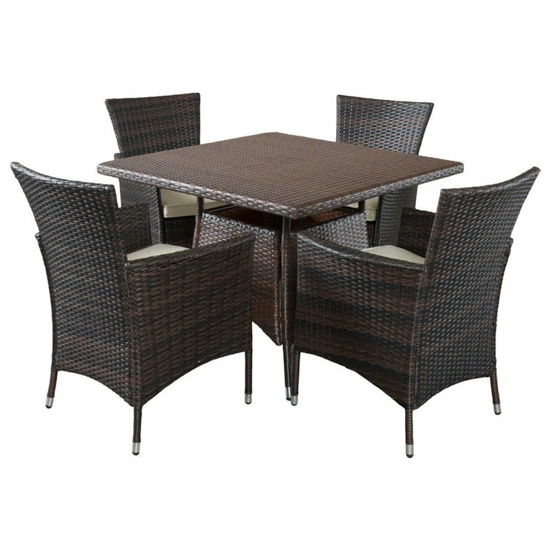 Enjoy the outdoors or poolside with the Clementine 5pc dining set. Constructed from multi-brown all-weather wicker, this contemporary set includes one (1) square table and six (4) dining chairs with water resistant seat cushions. Perfect for enjoying outdoor meals, this set can be placed in your backyard, deck or poolside area.