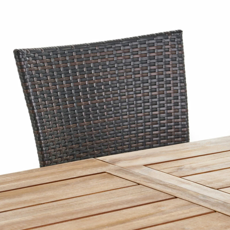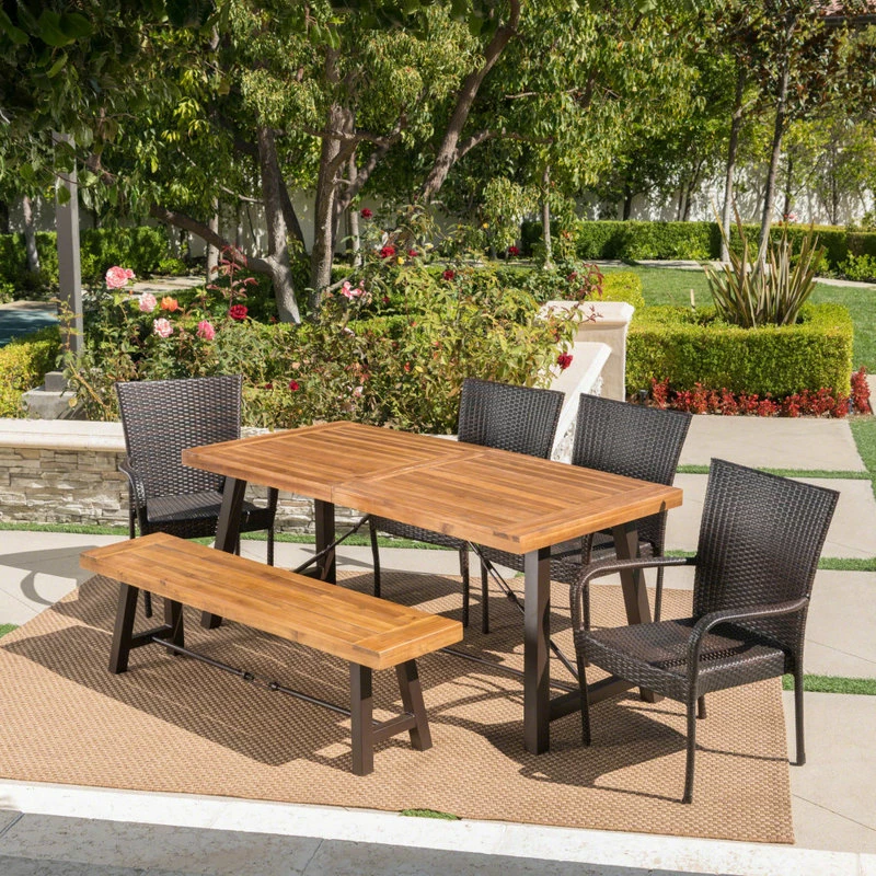 Feel fancy and fresh with the perfect centerpiece for your outdoor space. With a modern industrial style combined with the refreshing aesthetic of wicker, our six-piece dining set combines function and transitional design to create the perfect dinner party or afternoon luncheon for all your guests. Featuring a classic slat paneled table and bench made from gorgeous acacia wood, our dining set is made for both durability and impressive luxury while offering enough space for even the most extravagant meal.