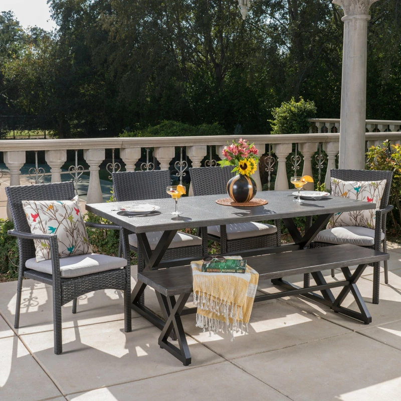 This attractive and comfortable outdoor table set gives you many options for seating, providing both bench and chairs. Complete with a table, bench, and 4 chairs, this set does it all. Made of the highest quality materials and crafted to the most exacting standards, this is the perfect addition to your patio, backyard, or garden.