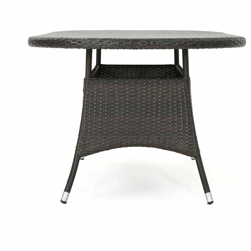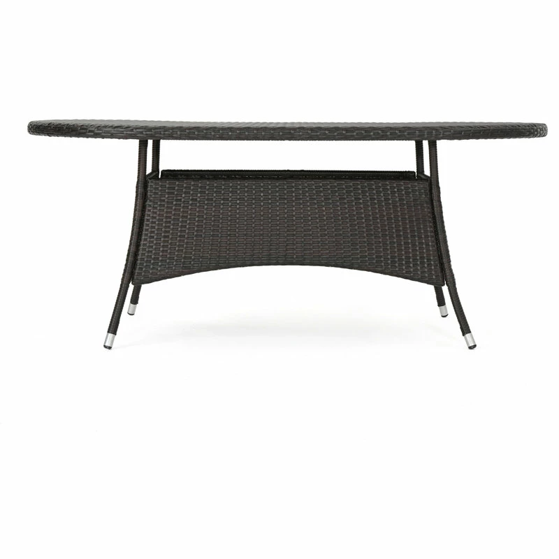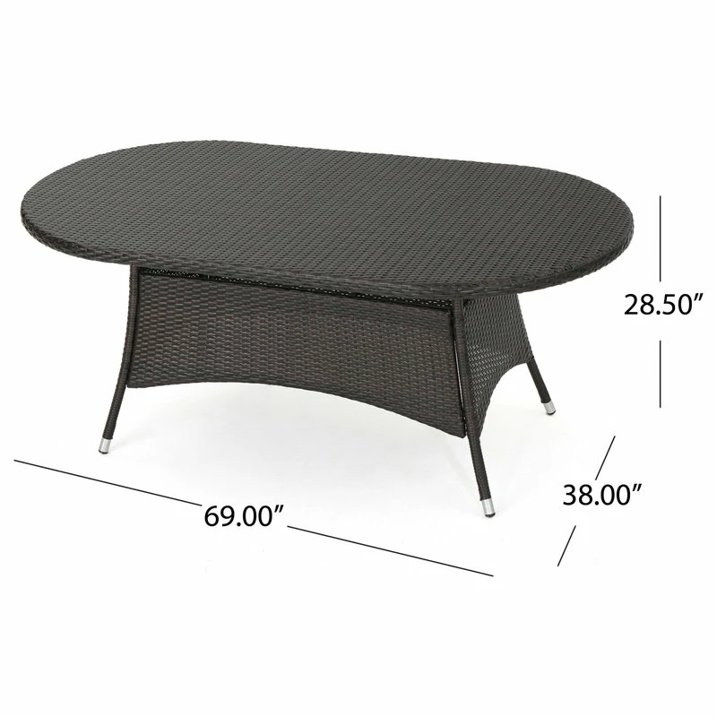 Enjoy the outdoors or poolside with the Carmela 7pc Dining set. Constructed from multi-brown all-weather wicker, this set includes one (1) long oval table and six (6) dining chairs. Perfect for enjoying outdoor meals, this set can be placed in your backyard, deck or poolside area.
