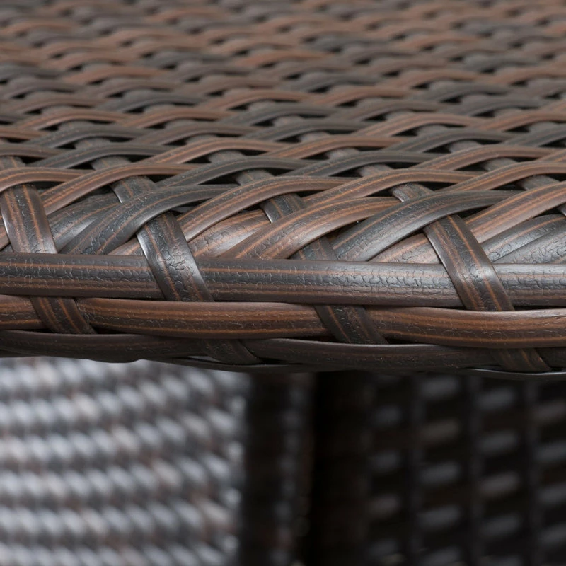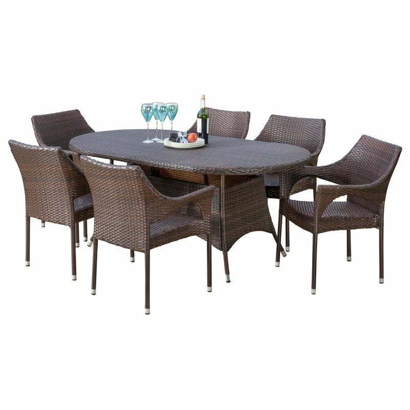 Enjoy the outdoors or poolside with the Clayton 7pc Dining set. Constructed from multi-brown all-weather wicker, this set includes one (1) oval table and six (6) dining chairs. Perfect for enjoying outdoor meals, this set can be placed in your backyard, deck or poolside area.