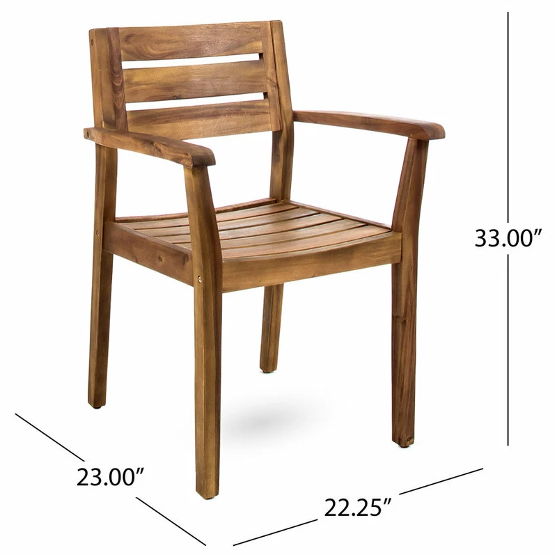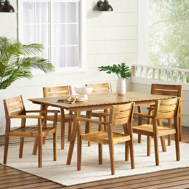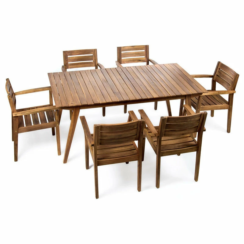 This complete wood dining set is the perfect solution to your outdoor dining search. Complete with six acacia wood chairs that pair beautifully with the matching acacia wood table, this set is sure to shine on your patio. Enjoy hosting again and through the best BBQ’s the neighborhood has ever seen with this top quality dining set.