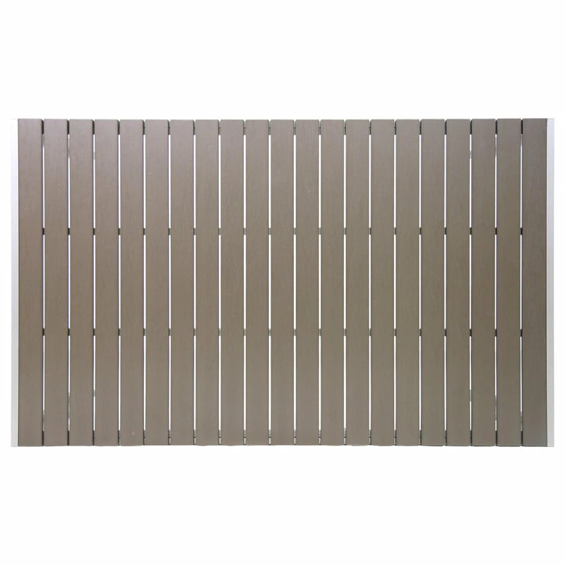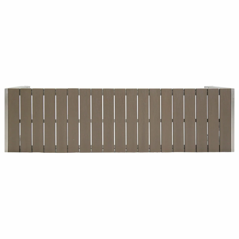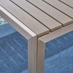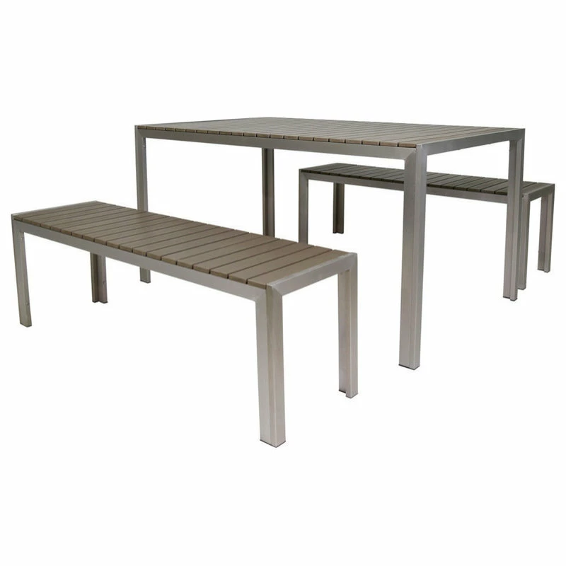 The golden age of mid-century convention lives on with the advent of this sleek and timelessly-stylish outdoor picnic set. These pieces feature streamlined aluminum frames that contrast starkly with a faux wood table top and seating surfaces. Including a table and two benches to match, this assemblage’s clean, unburdened design is modern, geometric, and at ease in any style of home.