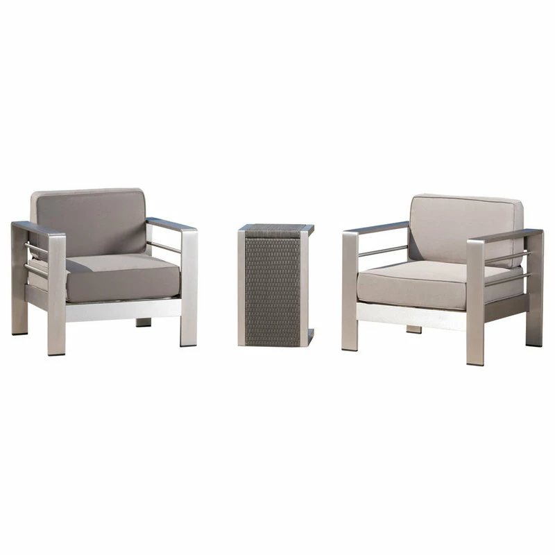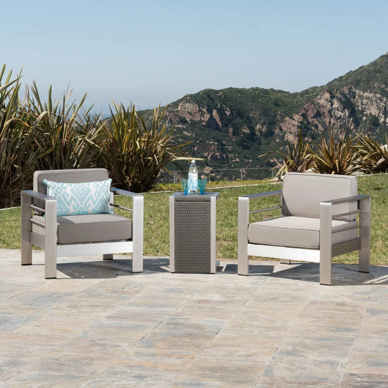 Place a C-shaped table between the two cozy club chairs and complete your patio with space for good company and chilled mimosas. With clean lines and durable aluminum frames, our three-piece chat set is made for both durability and comfort. Choose between Sunbrella or water-resistant cushions for long-lasting comfort that is sure to impress. Free khaki water-resistant covers arrive on the cushions with all Sunbrella orders. Sunbrella covers will be shipped separately and should arrive within 72 hours of your set.