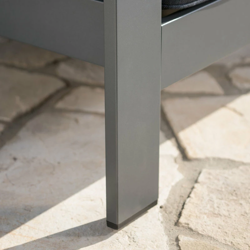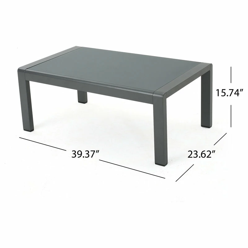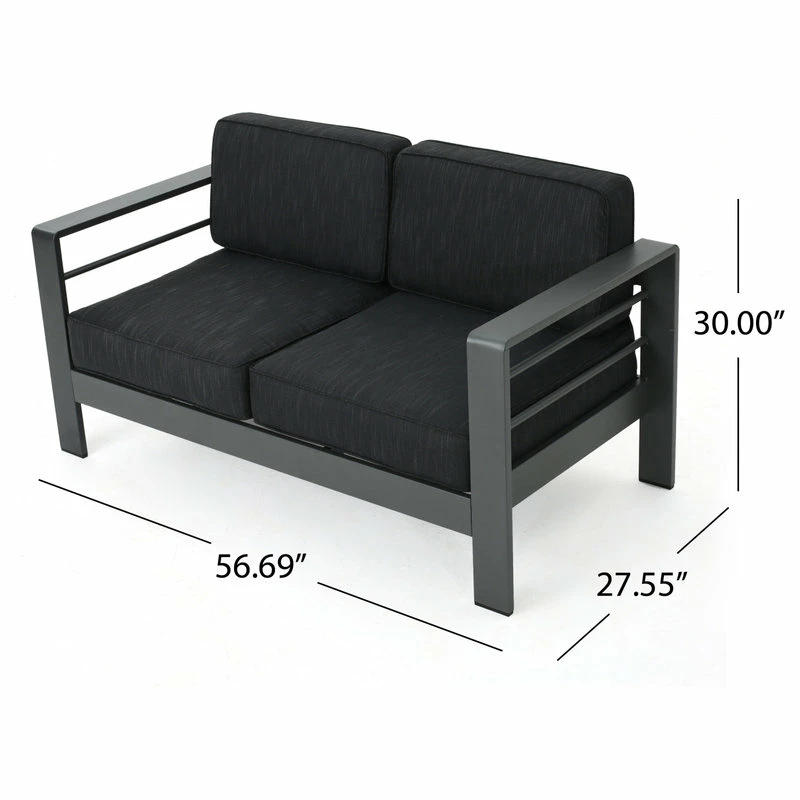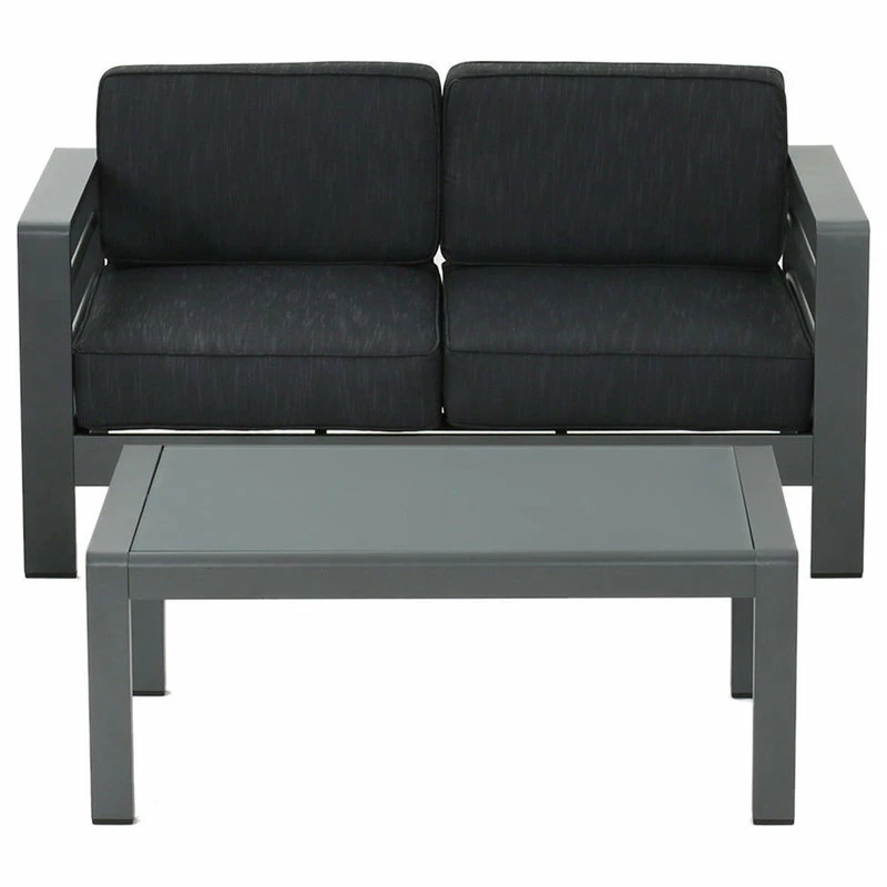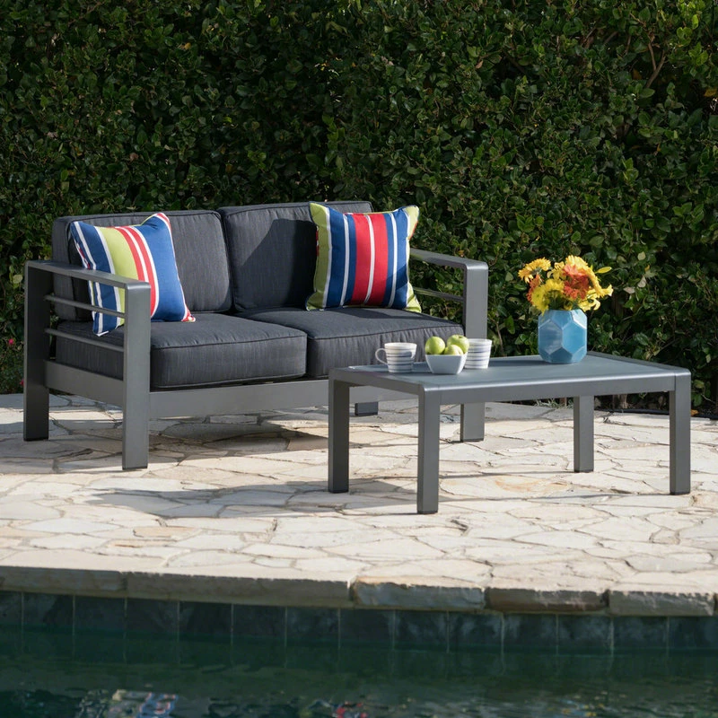 This aluminum loveseat and table are a great addition to any patio. The water resistant in conjunction/the aluminum make both the loveseat and table ideal for an outdoor setting. This stylish and comfortable set is the perfect way to add some extra seating and relaxation space to your patio without dominating your space entirely.