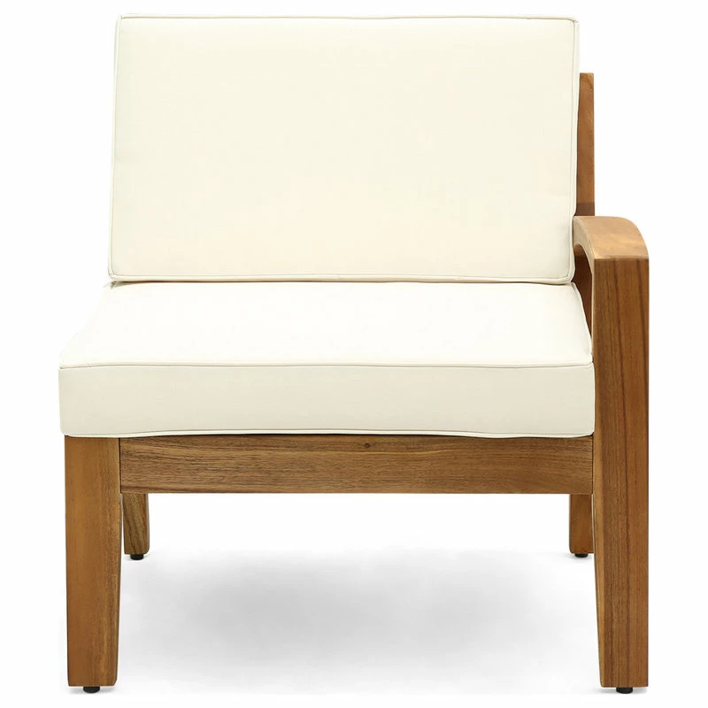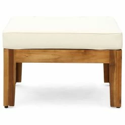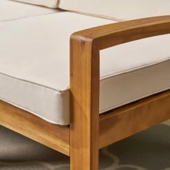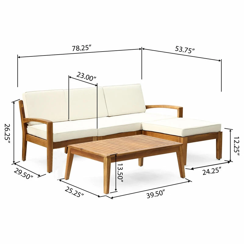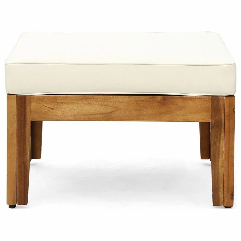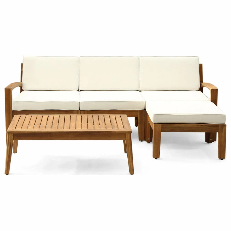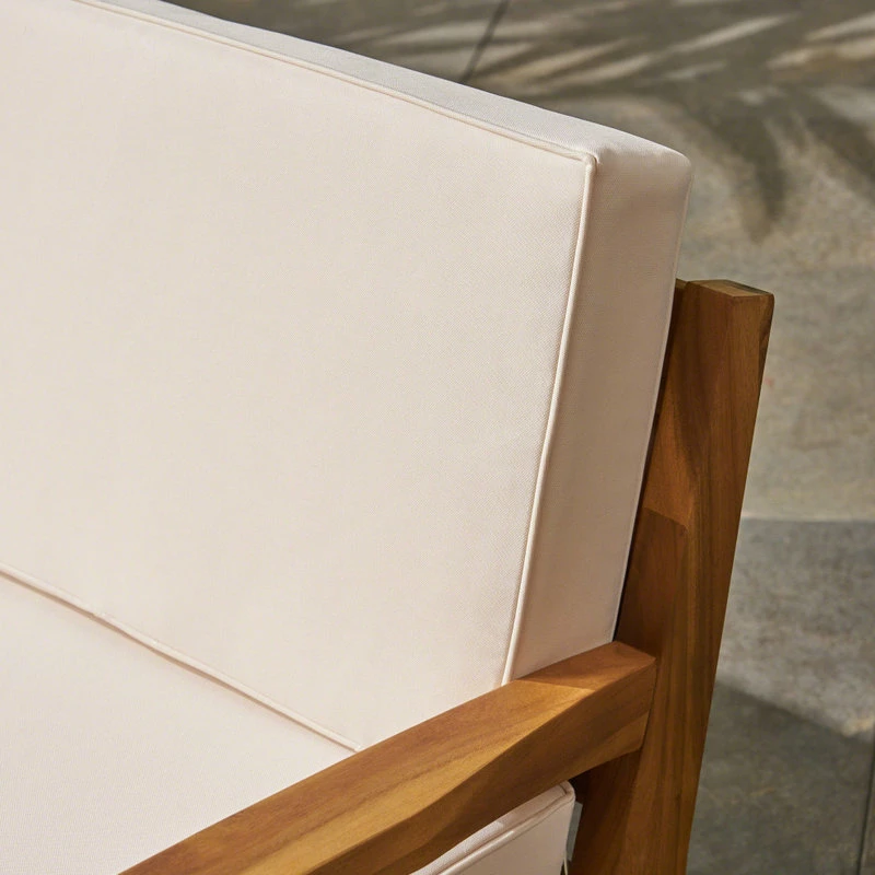 TRANSITIONAL: The transitional style of this sofa chat set with ottoman set is sure to give your outdoor space a minimalistic yet classic look that will match seamlessly with any arrangement you currently have. With a classic acacia wood frame and modern cushions, this set will give your backyard an instant upgrade in style and comfort.