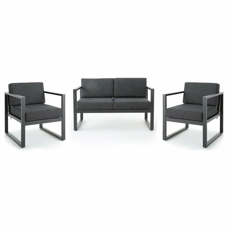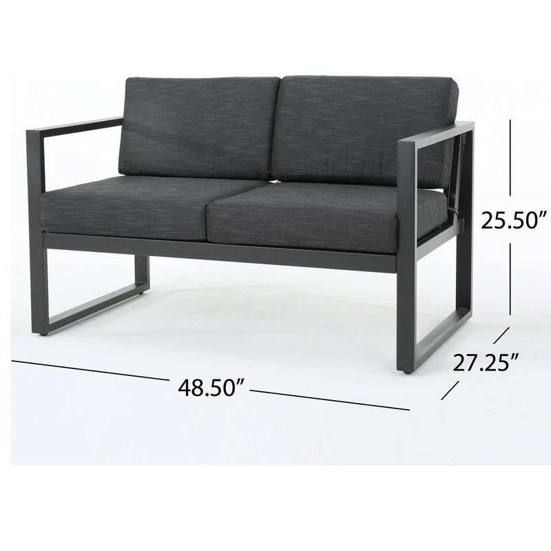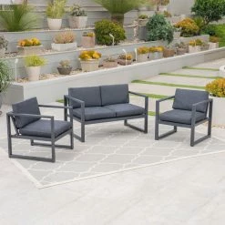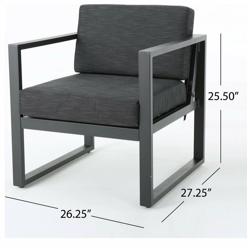This rust-proof aluminum framed chat set is the perfect addition to any patio or backyard. Complete with a loveseat and two club chairs, this set has it all. With extra plush cushions for comfort, this set is sure to be a fan favorite amongst your friends and family. Add a cover for those rainy days and this set will last you all year long.