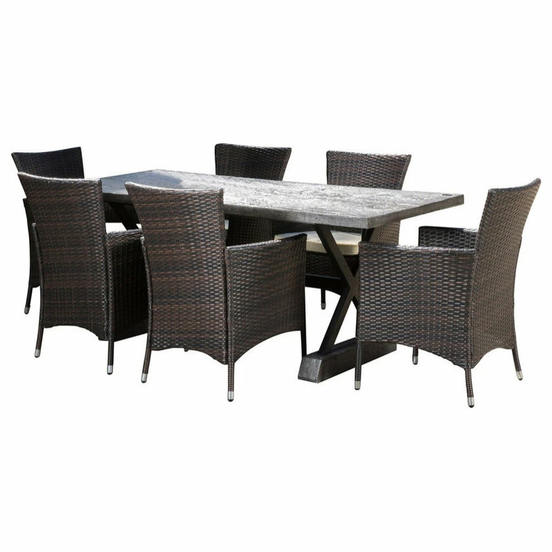 Every outdoor meal with your friends and family can be an experience that is above and beyond with the help of a dining set of impeccable style and stunning durability. Made with a mix of materials, including lightweight concrete and intricate wicker weaving, our dining set offers the look and feel of natural wood to immerse your backyard in a sophisticated vibe. Including four chairs with cozy water-resistant cushions, this exquisite dining set brings both comfort and refinement to any outdoor space.