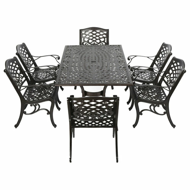 Create a patio that reflects the same style and charm as your lovely interior with help from this outdoor dining set. With seating for six, this stylish set is the perfect place to congregate with all your favorite people. Featuring durable cast aluminum construction and traditional hammered bronze or white finishes, this collection is bursting with timeless sophistication. An umbrella hole allows for complete customization and a classic, one-of-a-kind space. Set a breezy and beautiful scene on your patio with this stylish collection..