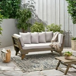 Transform your backyard into a private oasis with this stunning outdoor daybed. Made from sturdy acacia wood with impressive water-resistant cushions, this cozy, convertible outdoor daybed uplifts the way you lounge in your own backyard or patio space. This piece is finished with a convenient expandable feature, turning a snug sofa into a spacious daybed that meets all your leisurely needs. The rich wood finish and sleek design perfectly complement your backyard greenery and add much-needed style to your outdoor decor.