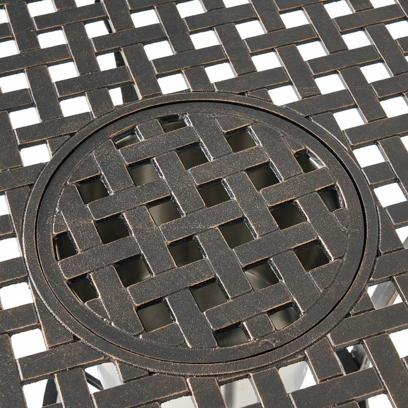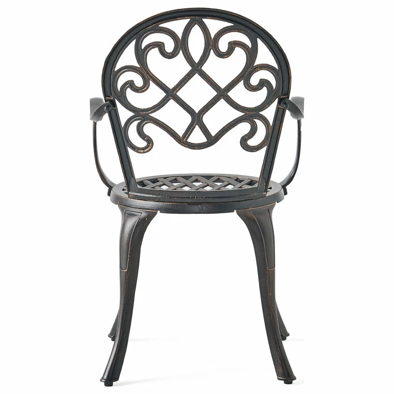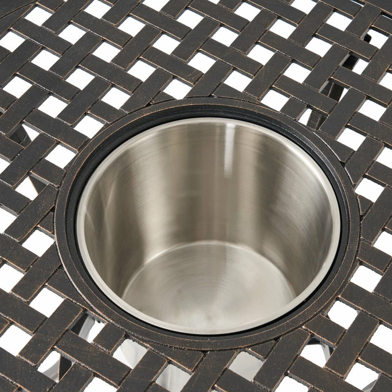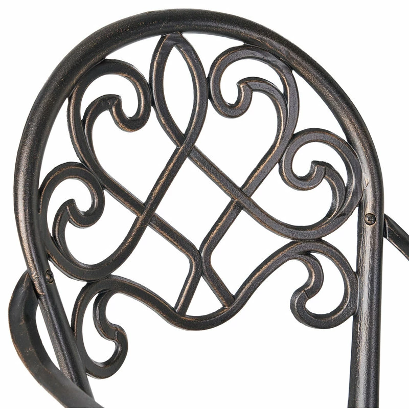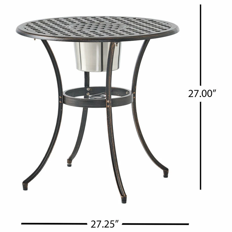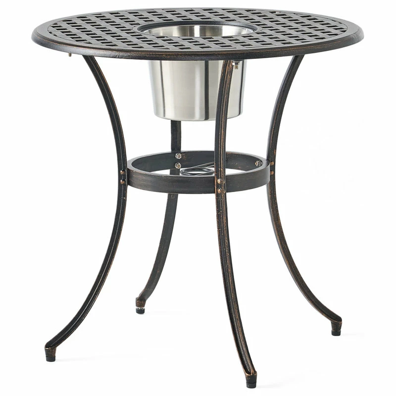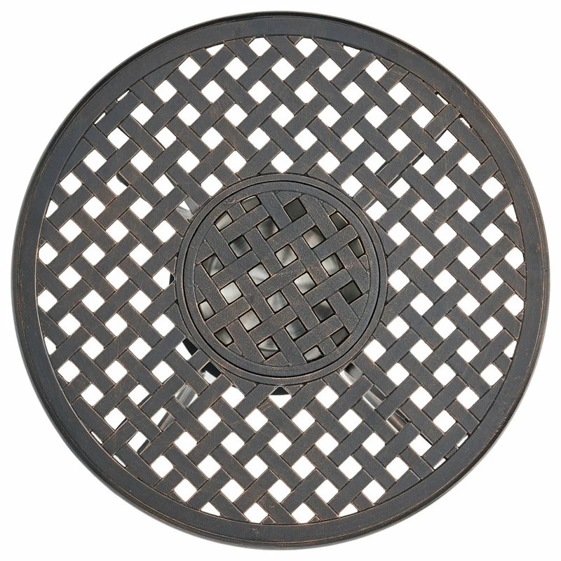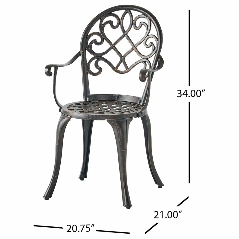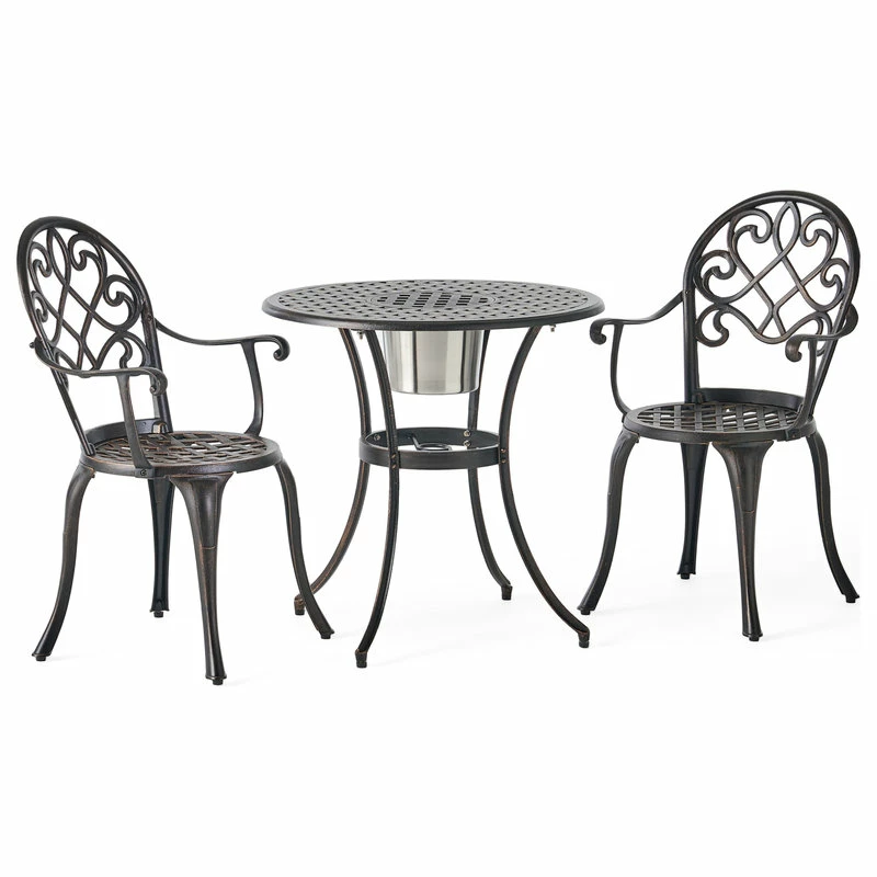 The Palermo bistro set is a beautiful addition for your outdoor decor. Made from cast aluminum, the set includes two, 2, chairs and one, 1, round mesh table. The features include intricate details on the chair backrest. Located at the center of the mesh table top is a convenient ice bucket to keep beverages chilled. The copper finish is neutral to match any outdoor furniture and this set will hold up in any weather condition. Whether in your backyard, patio, or deck, you’ll enjoy this set for years to come.