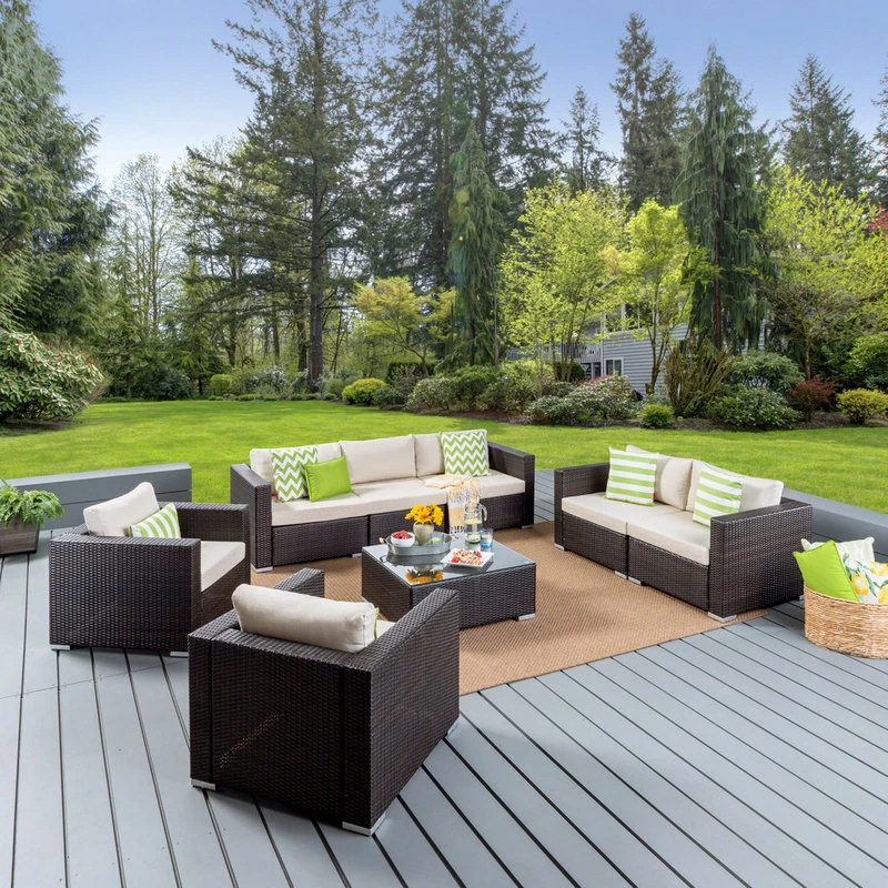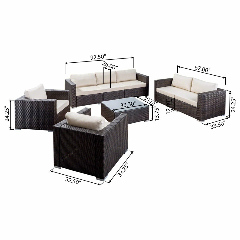 This sectional sofa set is great for any patio or backyard. Complete with a 7 seater, 8 piece sectional sofa this set does it all. Perfect for all of your outdoor hosting needs, this set features top quality wicker and an aluminum frame with water resistant cushions, plus a tempered glass table top on the coffee table, for the ultimate clean look. Enjoy hosting again this summer with this perfect sectional sofa set.