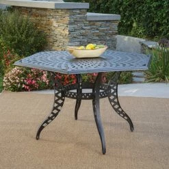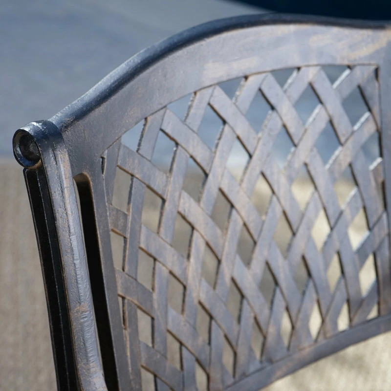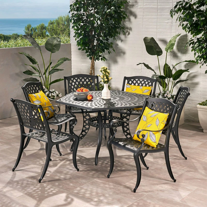 Impress your guests with a gorgeous dining set that gives your backyard or patio space an atmosphere of refined elegance. Featuring a beautiful classic look, our dining set opens any outdoor space into one of incredible design and texture. Made with cast aluminum and completed with an antique finish, this set functions as a unique centerpiece that easily seats six people. Finished with a convenient umbrella hole, this set provides you with a shaded option and ample space to enjoy endless summer days.