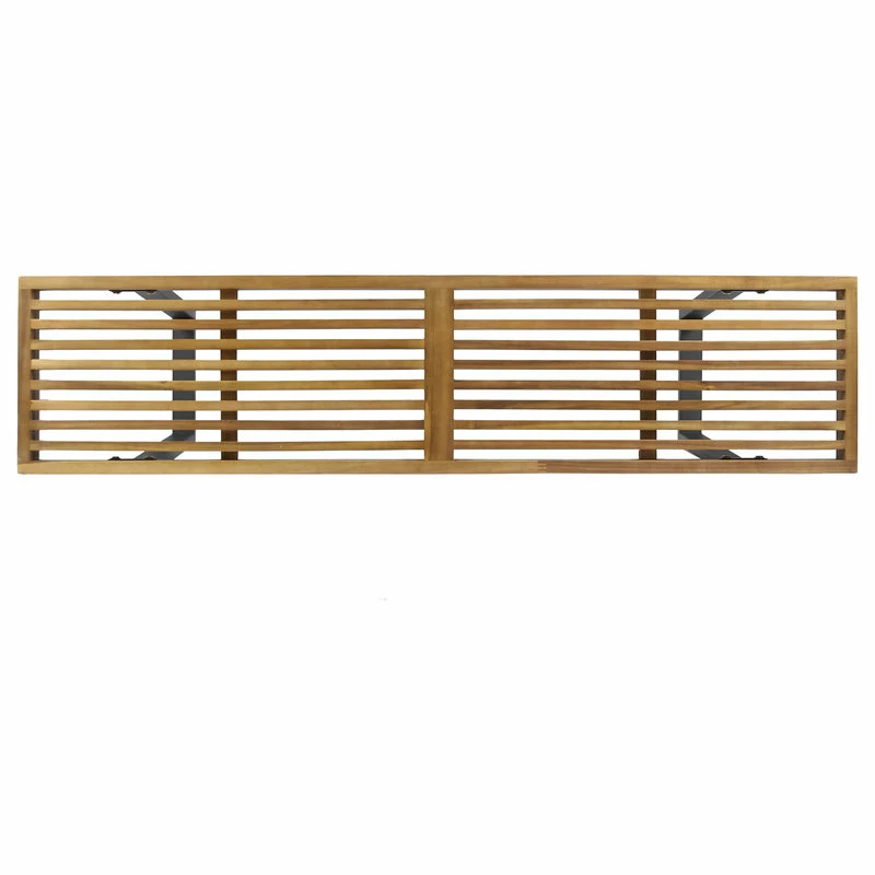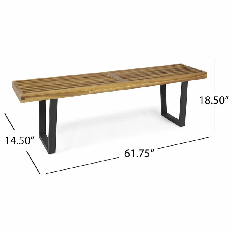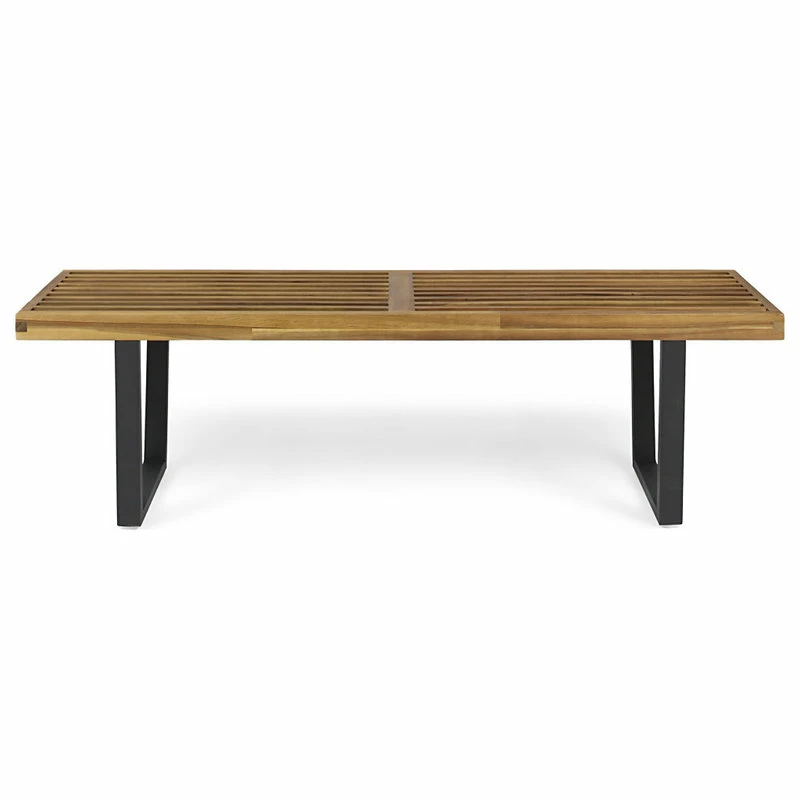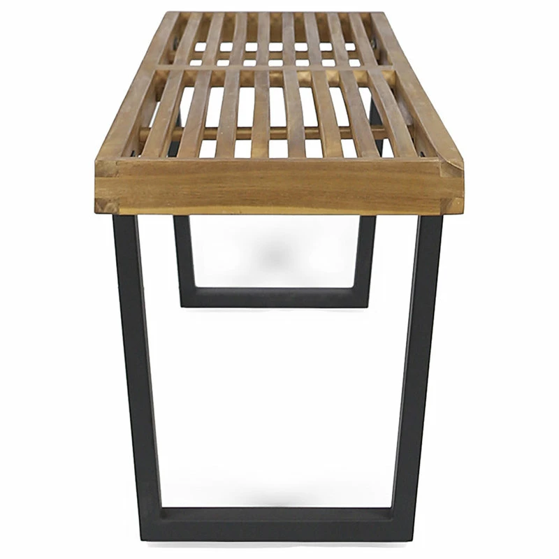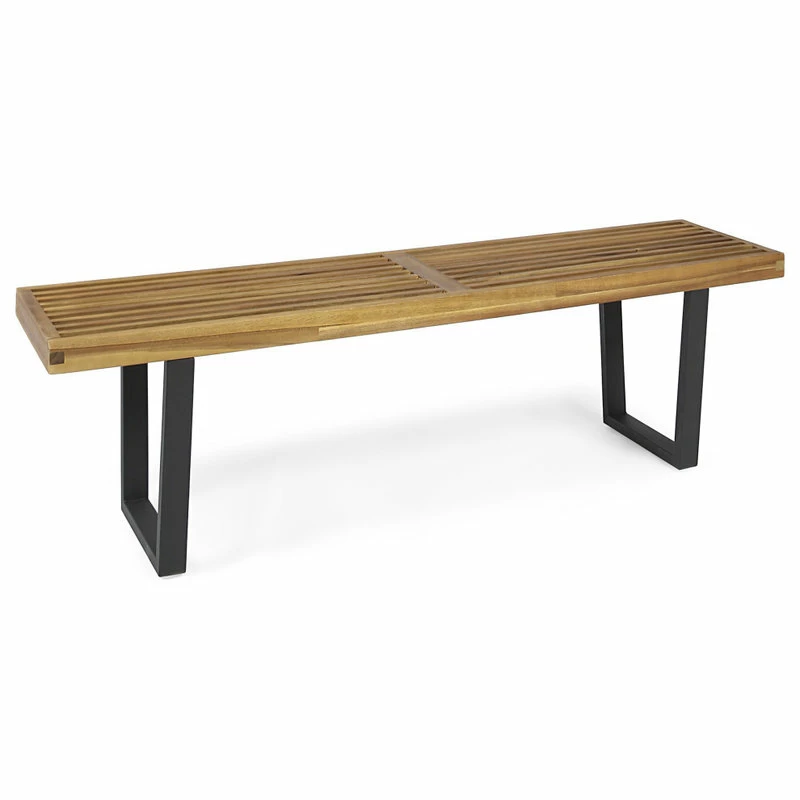- CONTEMPORARY – Minimal and artistic in design, this product sports a sleek, slatted acacia wood sitting surface finished in teak set atop two closed pairs of black iron legs.