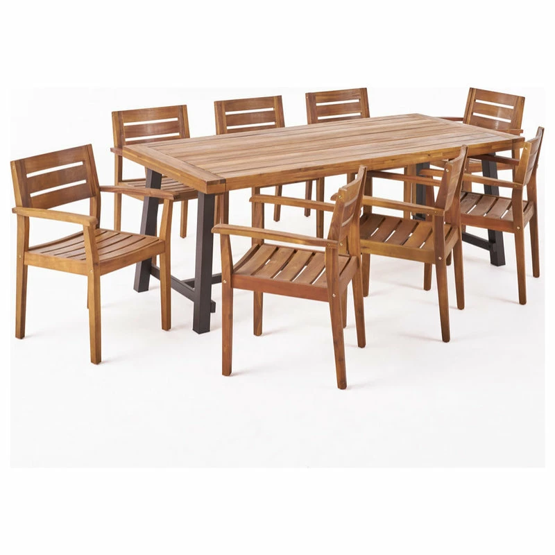 Impress your guests at your next backyard get-together with a dining set that will enliven your outdoor space. Our charming outdoor dining set brings home a timeless natural look that everybody adores. Seating up to eight people, this set provides ample space for all your guests, ensuring that nobody will be excluded from the festivities. Both the chairs and table of this set feature a sleek broad slat design, making this the perfect centerpiece to host parties on those endless summer nights.