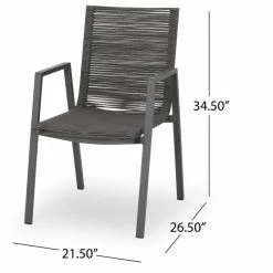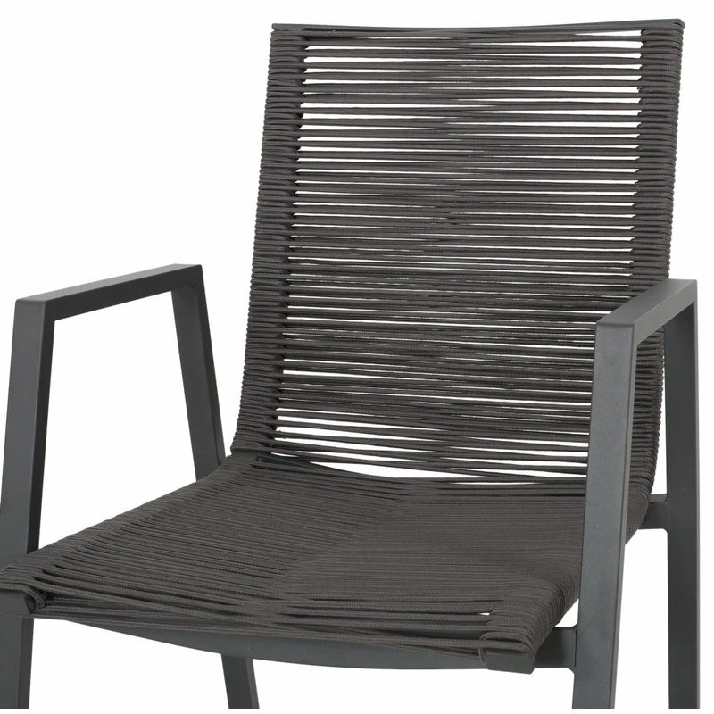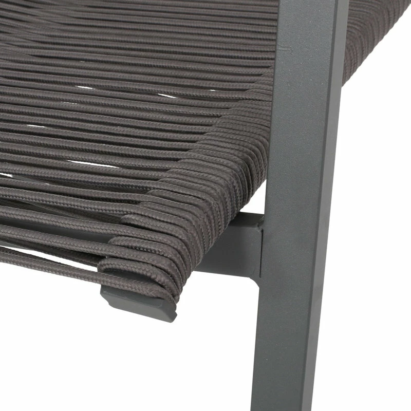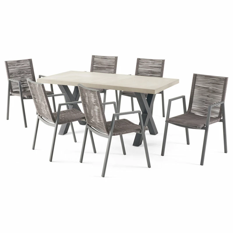 Bring home a subtle yet charming farmhouse touch to your outdoor space with a stylish dining set. Made with aluminum frames and lightweight concrete, our durable, high-quality dining set features unique rope weave seating to bring a sleek touch and delightful convenience to your backyard or patio space. This set will match any outdoor furniture while also providing incredible durability and unparalleled style for your space. Featuring an intricate woven design and edgy modern frames, our set will blend seamlessly into your summer routine.