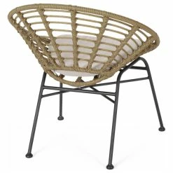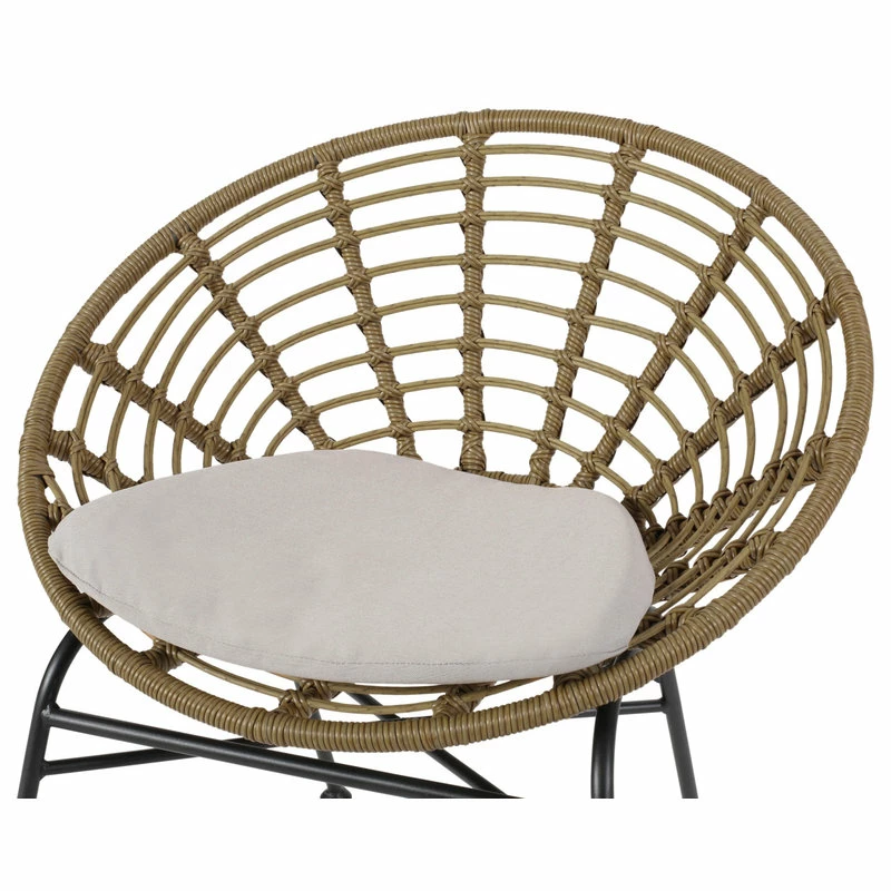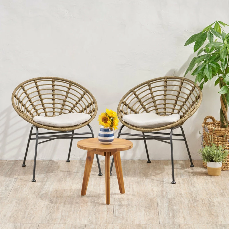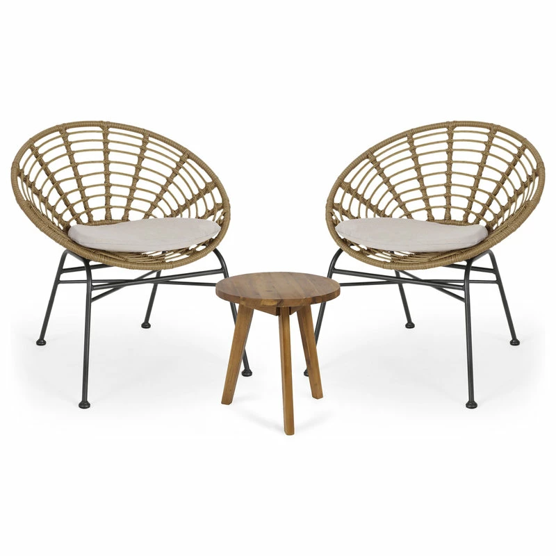 Sit back and enjoy the summer sun in a chat set that will cradle your body into a blissful state of relaxation. This set perfectly pairs the natural looks of wood and rattan wrapping with sleek, black metal to bring your outdoor space together with an effortlessly stylish flair. With an acacia wood side table and basket chairs made with thin angled frames and rattan finish, our chat set is crafted to superior excellence, offering assuring durability, ultimate comfort, and charming design.