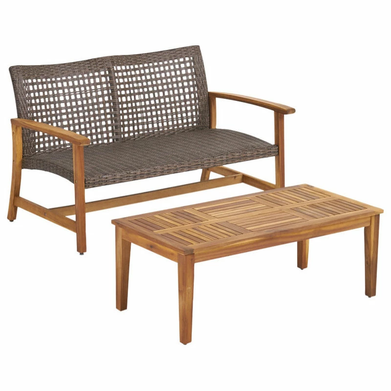 Spruce up your backyard or patio set with our outdoor loveseat and coffee table set that offers you generous seating and impeccable style. This set features beautiful, handwoven wicker seating and a smooth acacia wood table that provides a classic, homey look for any patio or backyard. Featuring a two-seat arrangement, this set is a cozy accommodation that maintains a reliable structure with its naturally durable acacia wood frame. This weather-resistant material leaves less time for hassle and more time for enjoyment with the ones you love.