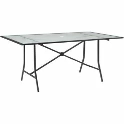- Tabletop features a tempered-glass inset and 2-inch diameter umbrella hole
