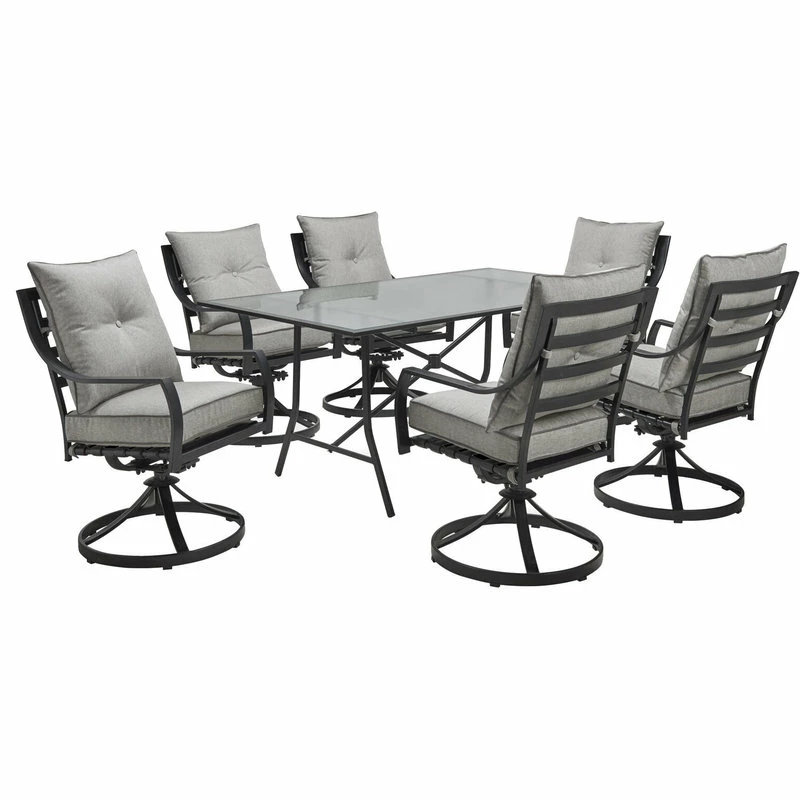 Transform your backyard into a sleek, modern dining space with the Lavallette Dining Collection. Perfect for outdoor gatherings, this 7-piece patio set includes six swivel rockers, six sets of back and seat cushions, and a 66-in. x 38-in. glass-top dining table. The slim frames are made out of heavy-duty steel and finished with a sleek black powder coating to increase its lifespan and durability. The tabletop contains a thick, tempered-glass inset for maximum strength outdoors. Each swivel rocker performs a smooth 360-degree spin and gentle rocking motion. The soft gray fabric contrasts perfectly against the bold black frames and is sure to enhance any natural setting. The thick foam cushions are wrapped in premium outdoor fabric that resists weather, stains, UV harm, and requires little to no maintenance throughout the year. Simply sit back and let the plush back and seat cushions cradle you in comfort as you savor every moment dining with your family and friends.