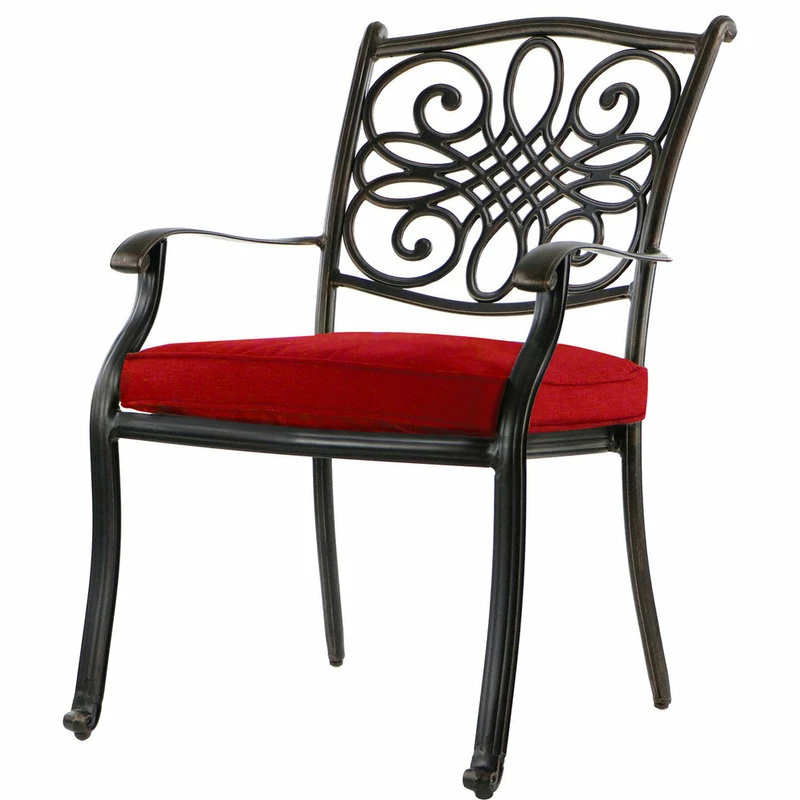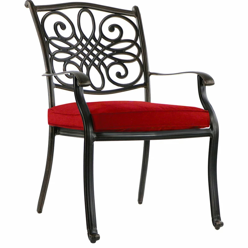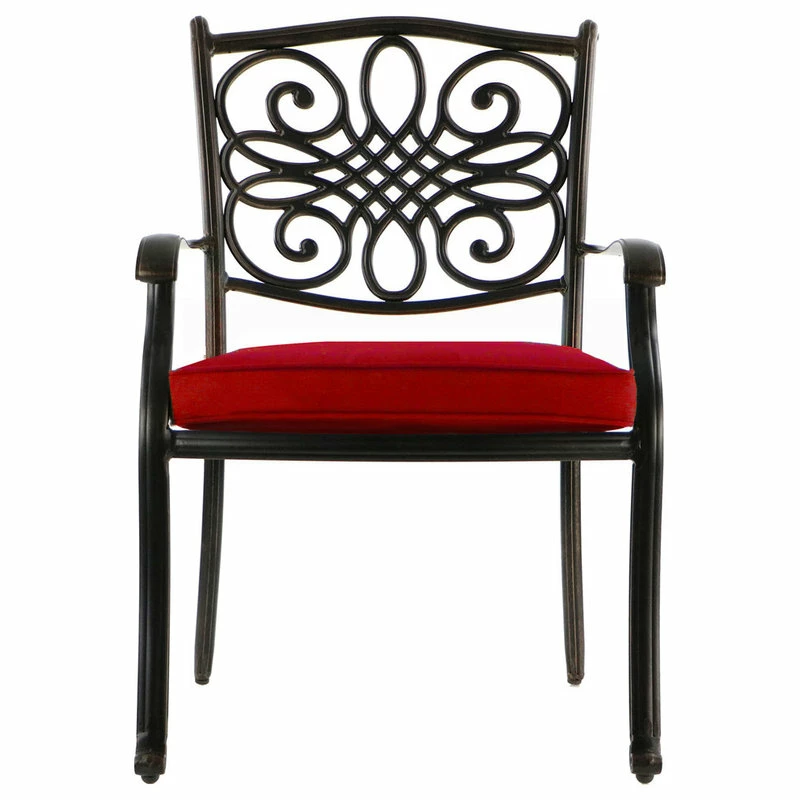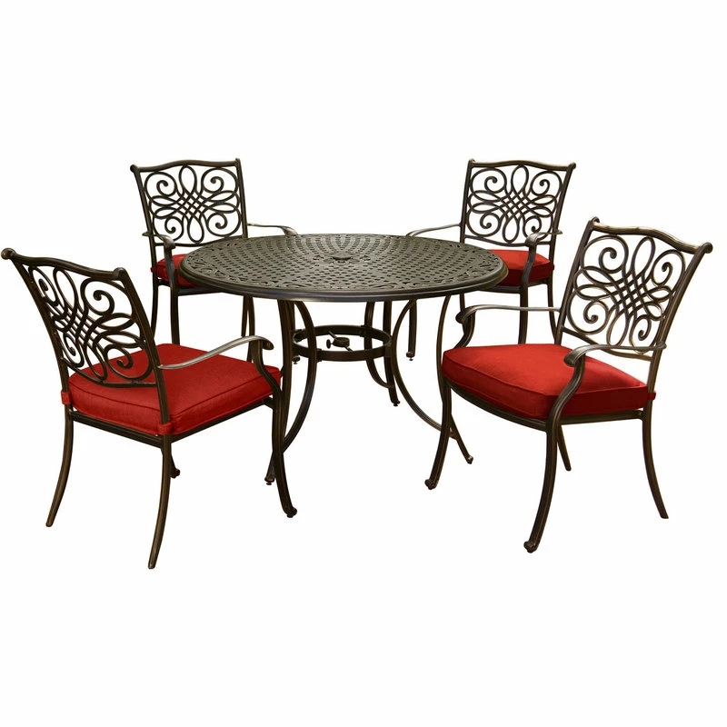 Add a pop of color to your outdoor dining space with the Traditions 5-piece dining set from Hanover. Featuring golden-bronze frames decorated in scrolling cast-accents, this set includes a 48-inch cast-top dining table and four stationary dining chairs. Plush red cushions are included for each seat, ensuring that your family and guests stay comfortable throughout the meal. These foam cushions are treated to resist stains, moisture, UV harm and maintain their original shape. The dining chairs are constructed with rust-resistant aluminum frames that are lightweight for repositioning, yet sturdy enough to hold their own against the wind. Elegant cast-accents scroll across the perimeter of the 48-inch round table top. The center contains an open-lattice design as well as a 2-inch umbrella hole for additional convenience. Built-to-last and easy to maintain, the Traditions Collection will quickly become the centerpiece of your outdoor landscape as you enjoy unlimited meals under the sun.
