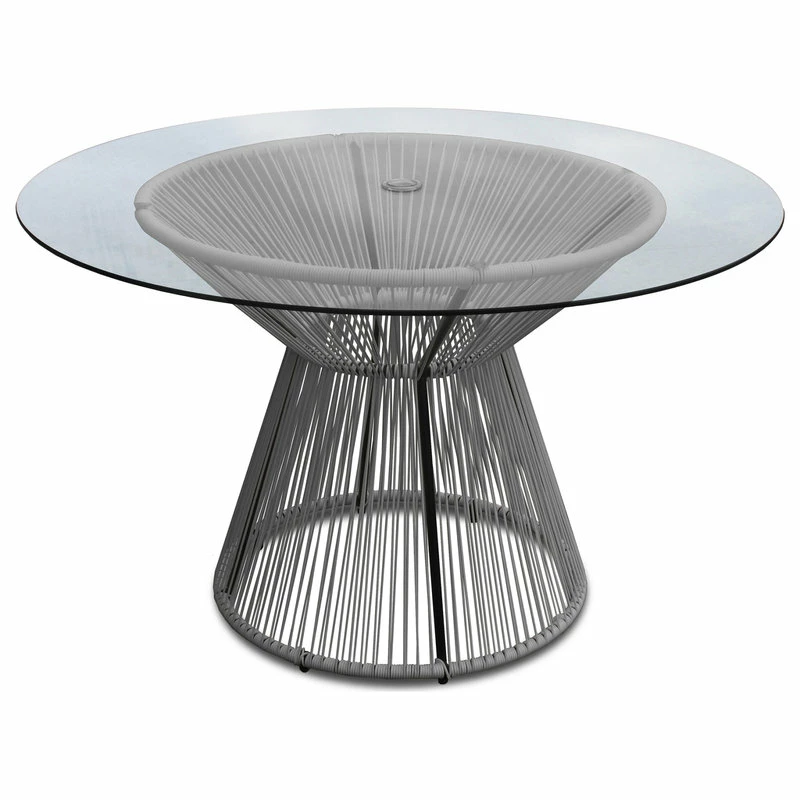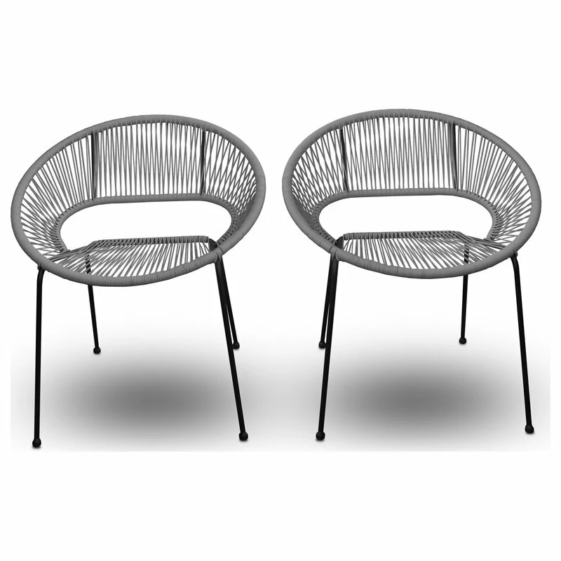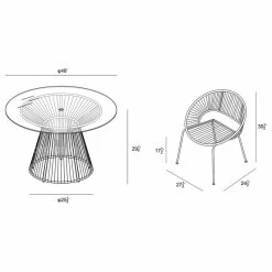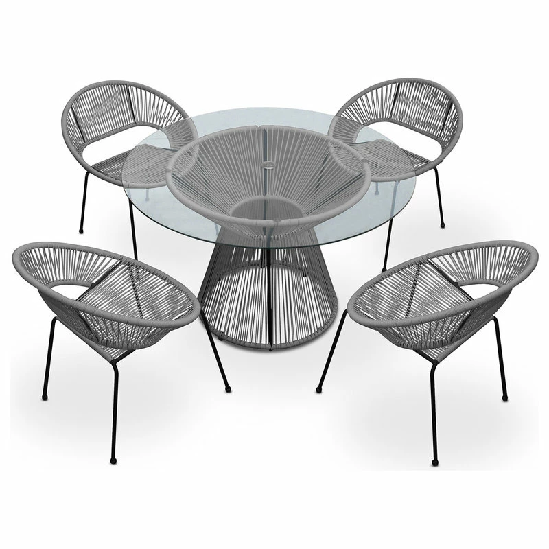 The Acapulco Collection by Harmonia Living blends mid-century design with modern funk to create a new standard of comfort and style. The collection is inspired by woven furniture that was popular in Central America in the 1950s and ’60s, featuring a breathable and supportive design. This makes the Acapulco Collection ideal for dining even in the warmest climates. The collection is constructed with powder-coated steel frames, making it incredibly durable and weather-resistant. The black frames are wrapped in a supportive Polyethylene cord, creating the hammock-like netting that is the hallmark of the collection.The 5 Piece Acapulco Dining Set includes 4 dining chairs and a dining table for comfortable outdoor dining and relaxation. The dining chairs are generously sized and are as great for lounging as they are for dining. The dining table has a spacious glass top with an umbrella hole, blending its sophisticated look with functionality. Overall, this set is sure to make an impression. If you are looking for patio dining that is both fun and sensible, then the Acapulco Dining Set is for you.