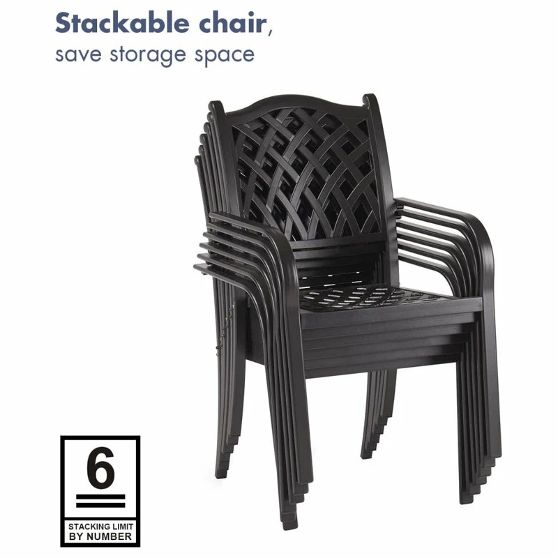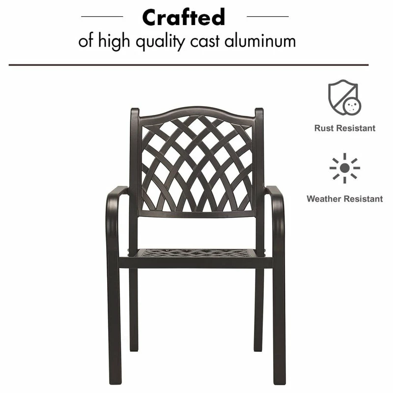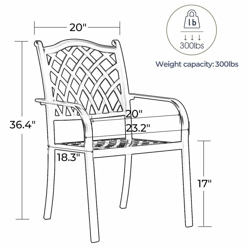 The outdoor furniture dining set is crafted of high quality cast aluminum, making these chairs both durable and lightweight. The powder coating surface is formulated so the set won’t chip, crack, or peel in the outdoor elements. With upgraded materials and a much stronger and wider seat, weight capacity of up to 300 lbs.