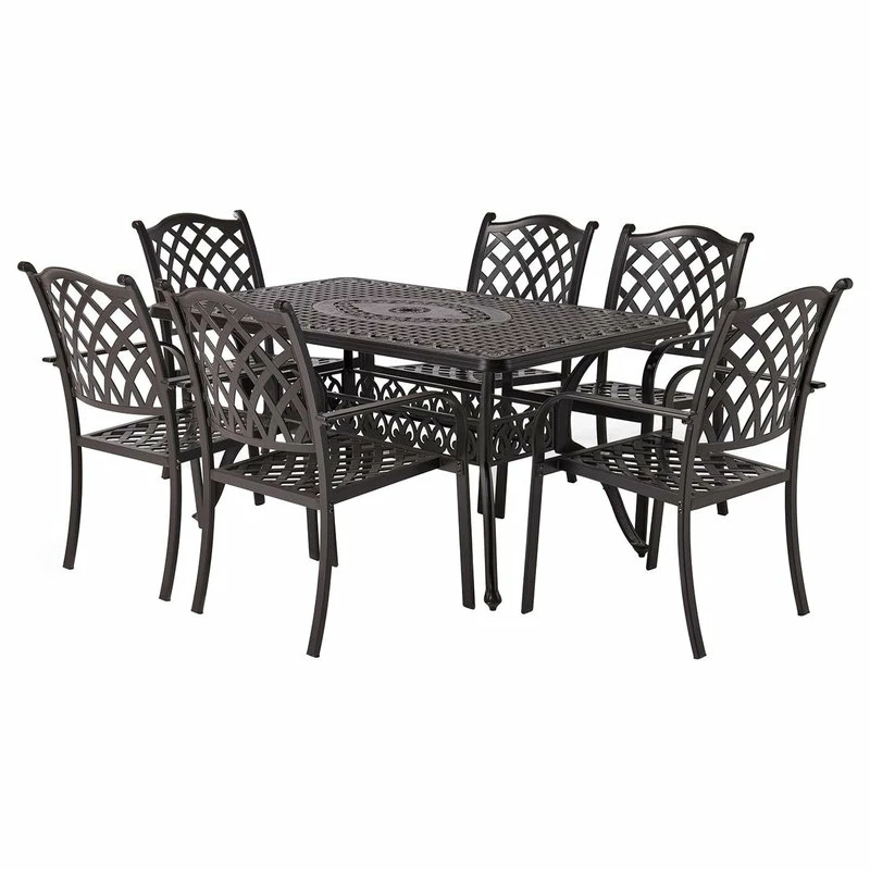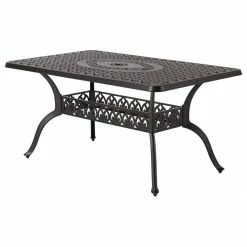 This dining set includes six (6) patio dining chairs and a 36″ x 60″ rectangular dining table. The outdoor dining chairs are ergonomically designed with a beautiful lattice weave back pattern, finely polished smooth armrests which bring you a better touch feeling and help you relax your body and reduce fatigue, also easy-to-clean. The lattice tabletop design gives an elevated appeal and has an umbrella hole(1.97″). The perfect addition to your patio, yard, deck, or porch.