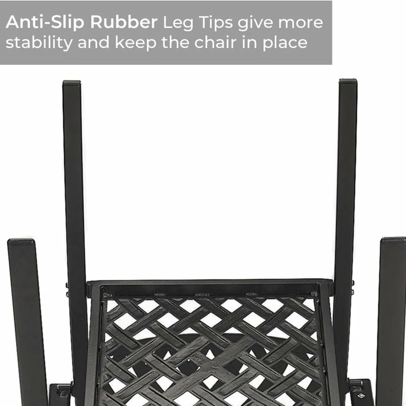Anti-slip plastic mats on the four feet of the metal chairs and table, can be slip-resistant and protect your floor when you move the stackable chair. These metal patio chairs are stackable which helps take up less room when storing them. we do not recommend stacking more than 6 chairs.