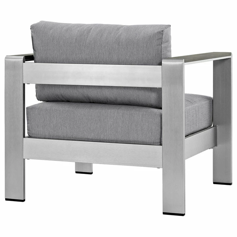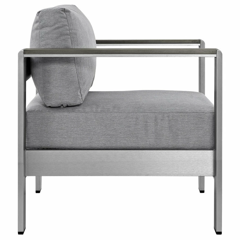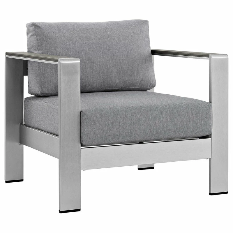 Enjoy your patio or backyard leisure time with the strong and durable Shore Outdoor Aluminum Armchair. Made with an anodized brushed aluminum frame and non-marking black plastic foot caps, Shore comes outfitted with resilient fabric canvas tested to last through all weather conditions. The Shore Outdoor Aluminum Armchair complements your casual gatherings with a look and functionality you can rely on.