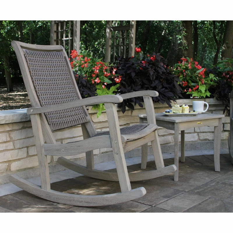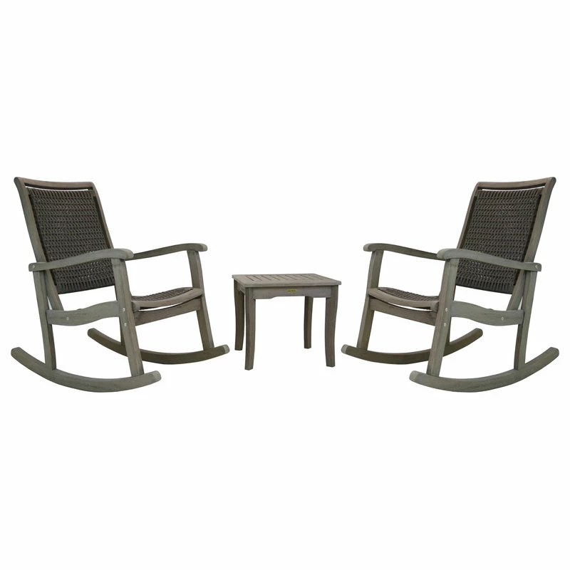 The Outdoor Interiors 3 pc. Grey Wash Eucalyptus & Driftwood Grey Wicker Rocking Chair Set is made from sustainable, plantation-grown eucalyptus and HDPE all-weather wicker for long-lasting outdoor use and exceptional durability. The grey wash texturing process begins with machine and hand brushing to create a grainy texture and vintage look. Three coats of high-quality all-weather stains are applied for an elegant look and feel.