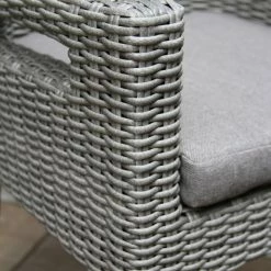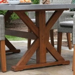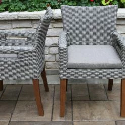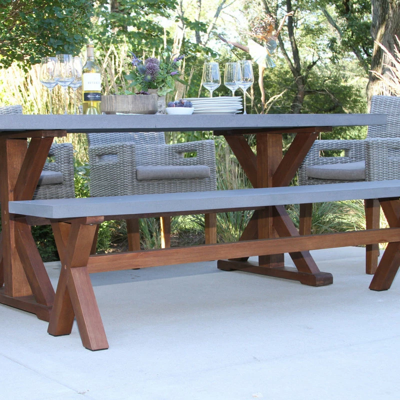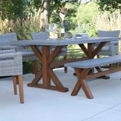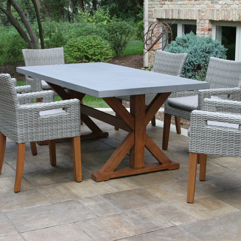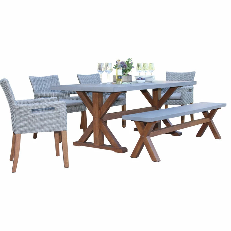A large and solid hardwood base supports the 6 Piece Dining Set. This rectangle table begins with the highest quality eucalyptus. The composite table and benchtop construction is made from a molded poly resin and blended with powdered concrete for texture and density, the classic and versatile style pairs well with the wicker and eucalyptus armchairs.