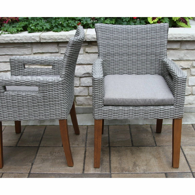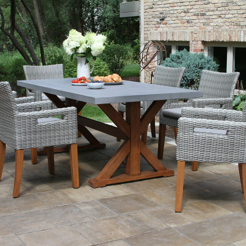 The Outdoor Interiors 7 pc. Eucalyptus, Composite, and Wicker Dining Set is the perfect table for patio cookouts with family and friends. This rectangle table is made with the highest quality eucalyptus. The composite tabletop construction consists of a molded poly resin and blended with powdered concrete for texture and densityโthe classic and versatile style pairs well with our wicker and eucalyptus armchairs with cushions. The table does include an umbrella hole.