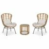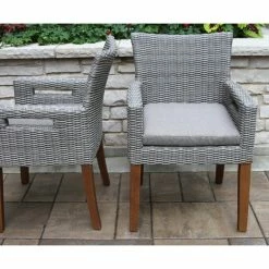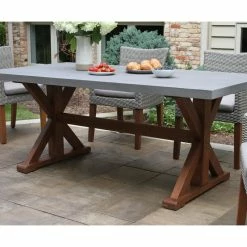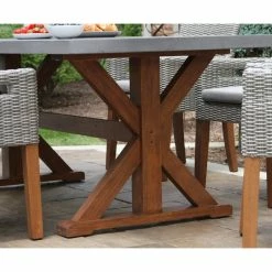 - Materials: Eucalyptus, olefin cushions, HDPE all-weather wicker, and polyresin and powdered concrete blend