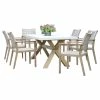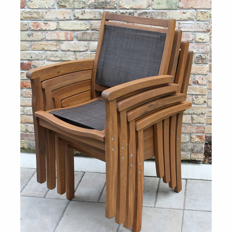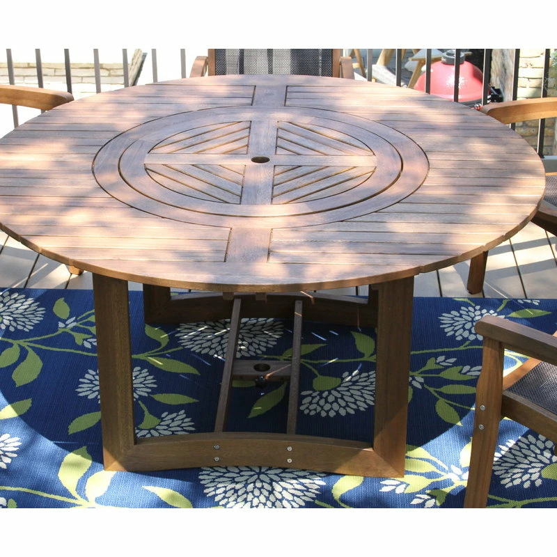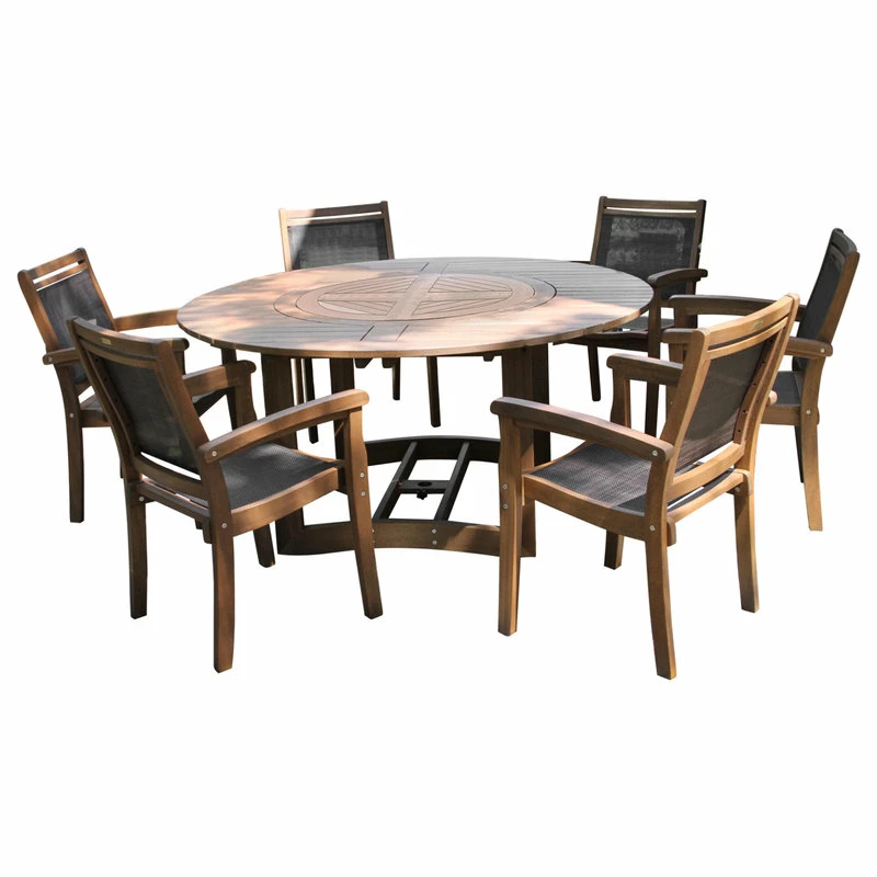 The Round Eucalyptus 63″ Dining Set includes 6 chairs and a built-in lazy Susan! The set is made from plantation-grown Eucalyptus and is finished with a beautiful brown umber stain. The set includes 6 dark brown sling & eucalyptus chairs. The sling material is a woven resin fabric that is weather resistant to the harshest elements allowing water, sun, and extreme temps to permeate with no ill effects. The Lazy Susan table fits up to 8 chairs comfortably, and extra sling chairs can be purchased.