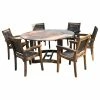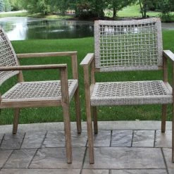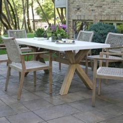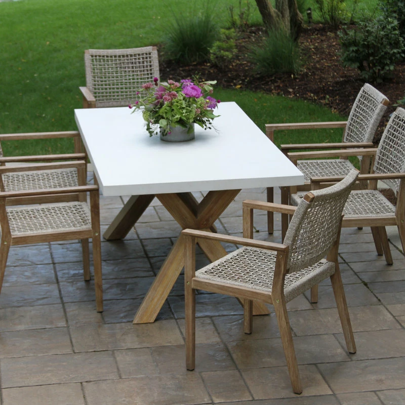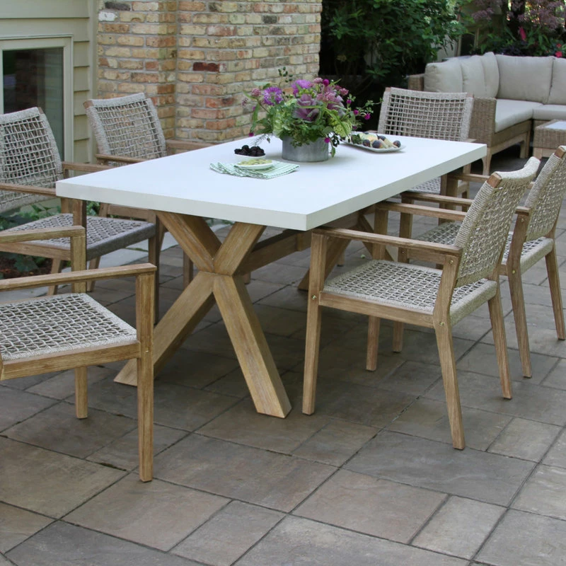 This dining set is made from sustainable, plantation-grown eucalyptus, wheat-toned all-weather nautical rope, and a molded polyresin and blended with a powdered concrete for texture, density, and long-lasting durability in all climates. The composite’s final unique finish, which appears like freshly poured white and ivory concrete, is durable and resistant to many tough stains for years of use and enjoyment. The eucalyptus bases are gently brushed for texture and then stained and washed in a beautiful UV inhibited lasting finish. The table includes an umbrella hole and a matching composite plug.