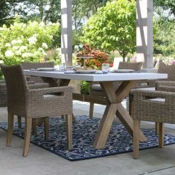 This 7-piece Dining Set is made from sustainable eucalyptus hardwood. The composite tabletop construction is made from molded polyresin and blended with powdered concrete for texture, density, and long-lasting durability in all climates. The unique final finish, which appears like freshly poured white and ivory concrete, is durable and highly resistant to many tough stains for years of use and enjoyment.